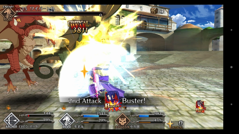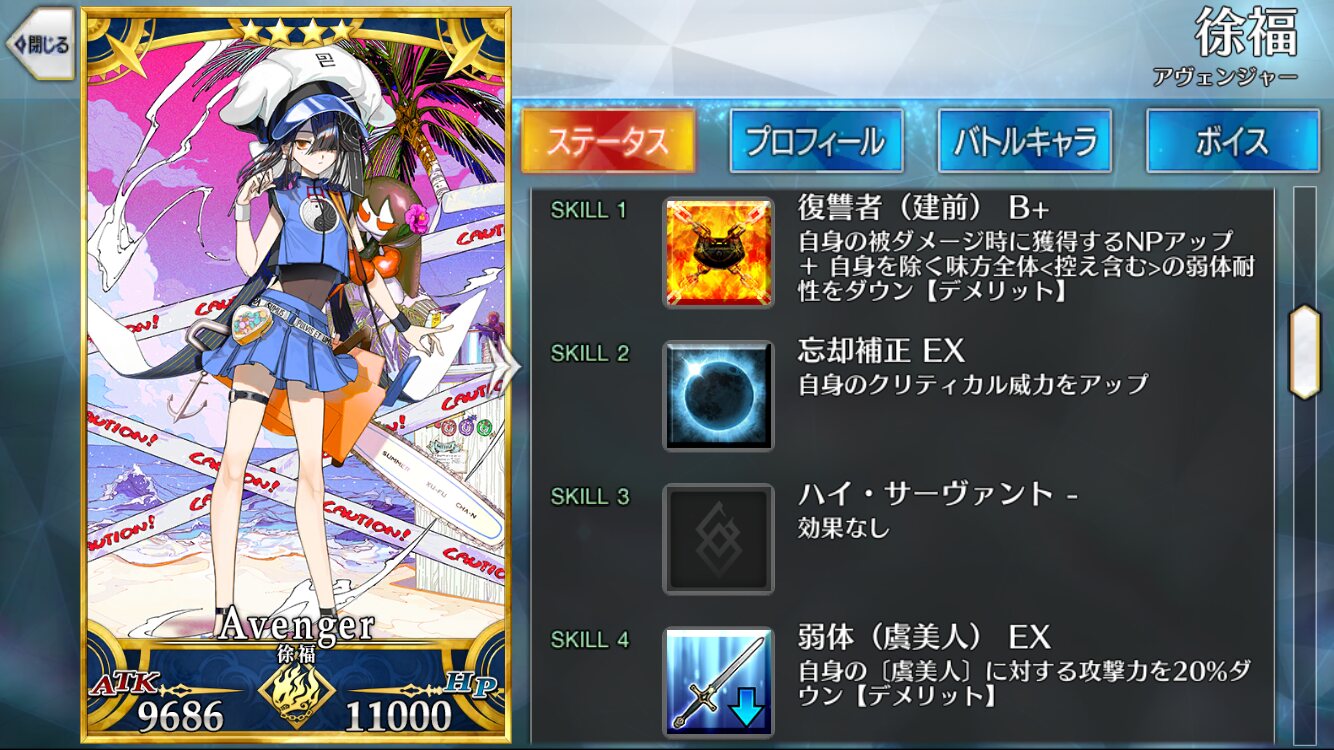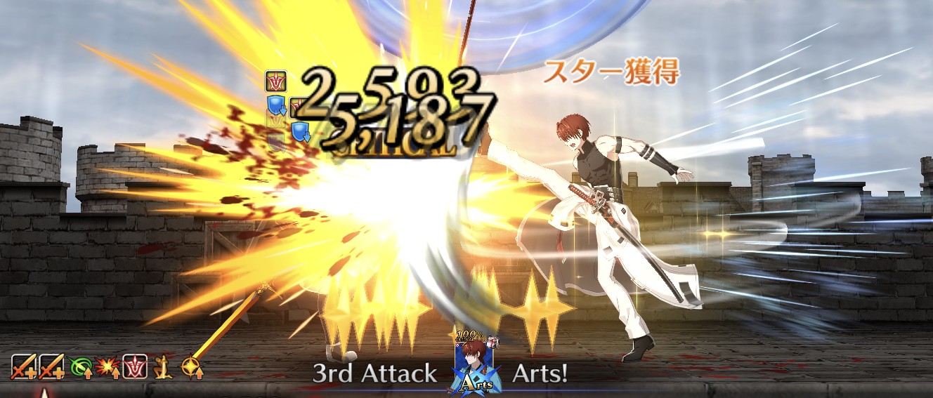 スキル1『死番』自身にタゲ集中とNP獲得量、クリ威力アップを3Tずつ付与。NP効率は被ダメ時も上がるから殴られたぶん溜まりやすくなるのも魅力ね