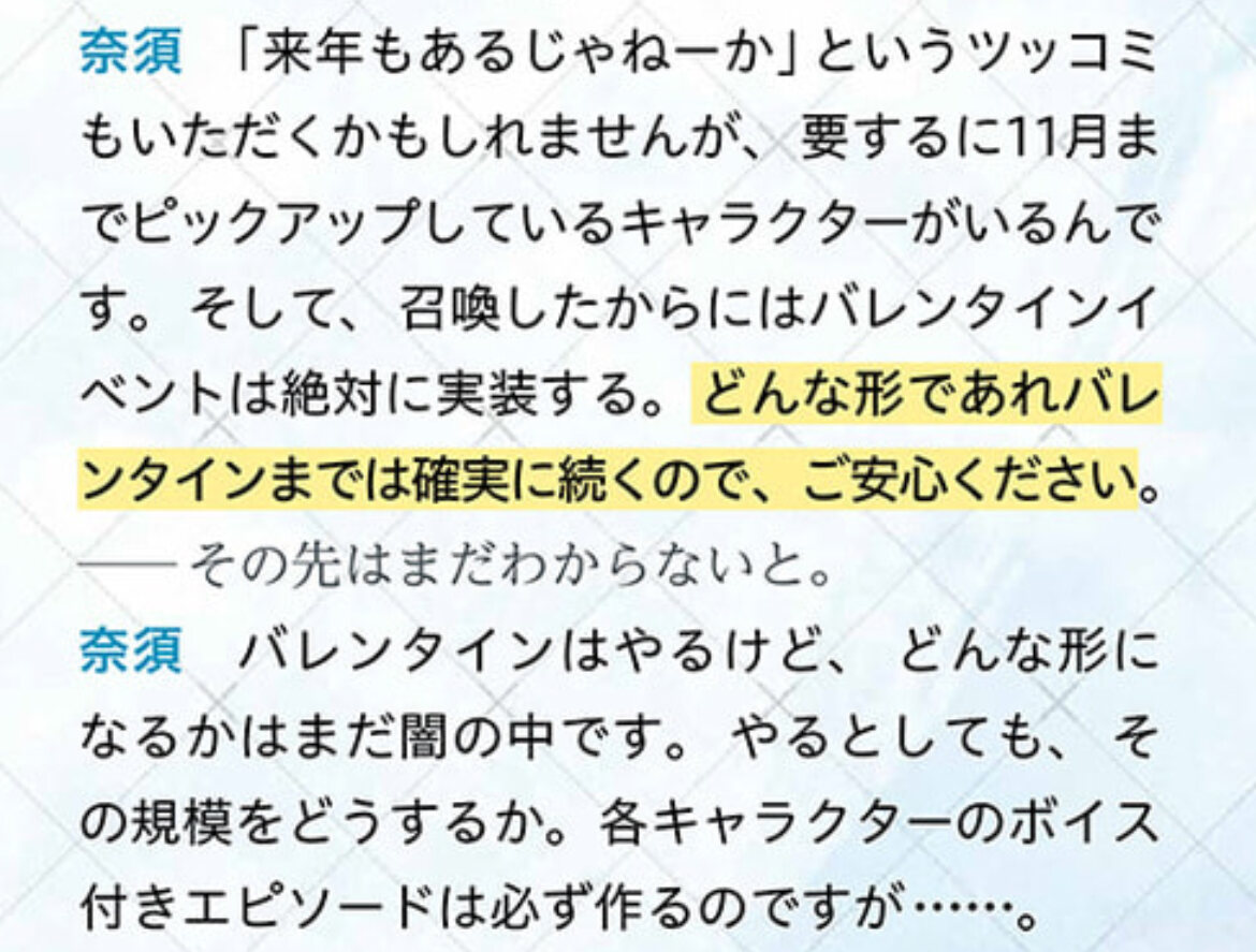 R18関連話題、よくてよ無しのガチャ結果、実装から二週間以内のシナリオ及び開催期間中のイベント内容、進行度依存の報酬、最終再臨や霊衣解放の画像や話題は専用スレにてお願いします