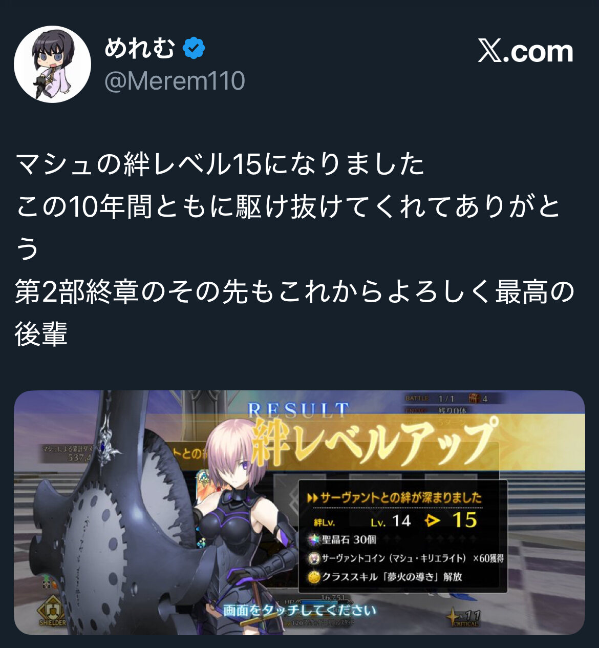 零、虚、空、無、その先へと剣を届かせることが出来ただけでなく、「至るため」に振るった剣じゃなく「大好きなカルデアを守るため」「正義の味方として」振るった剣が己自身の目的を達成する剣になったことが最大の幸福。