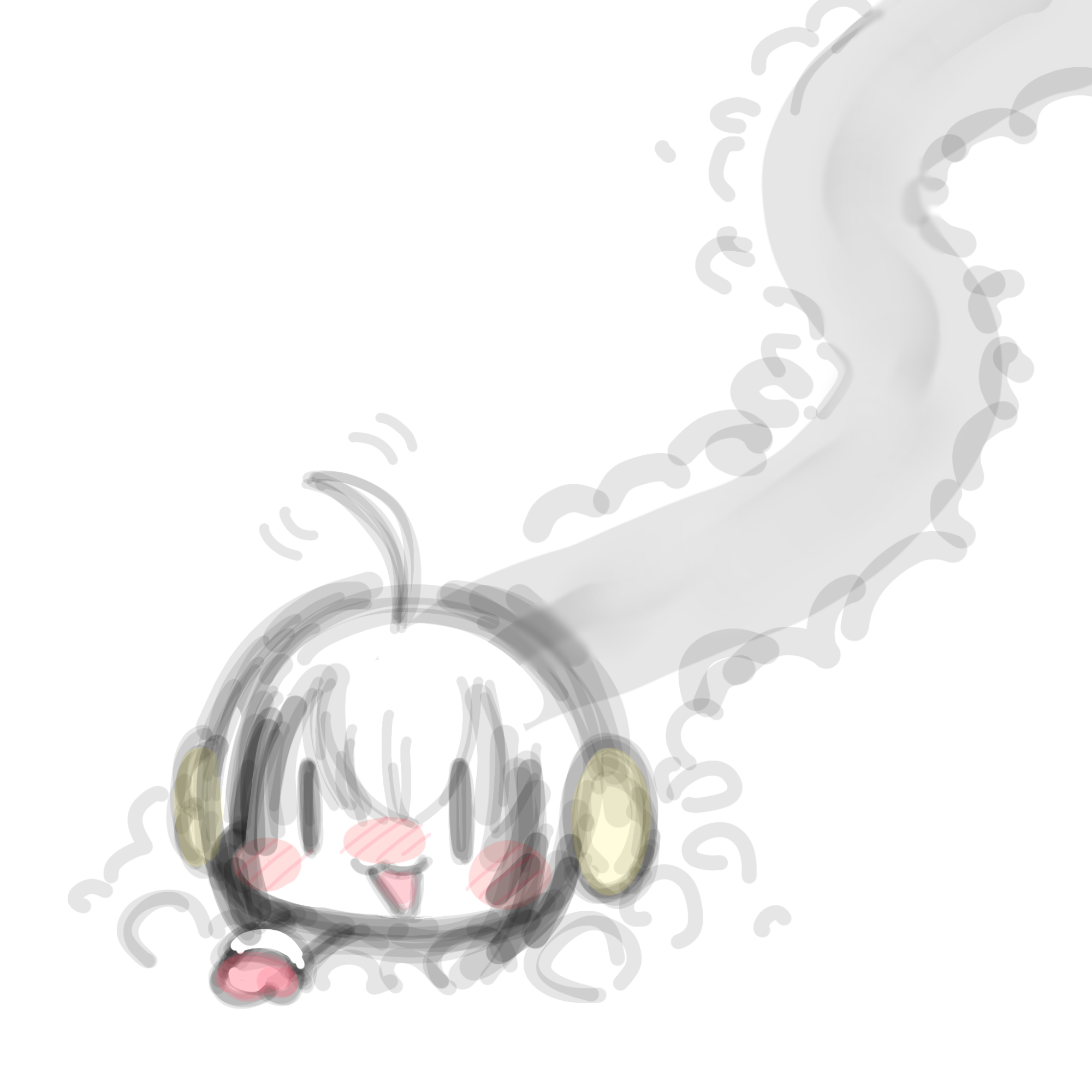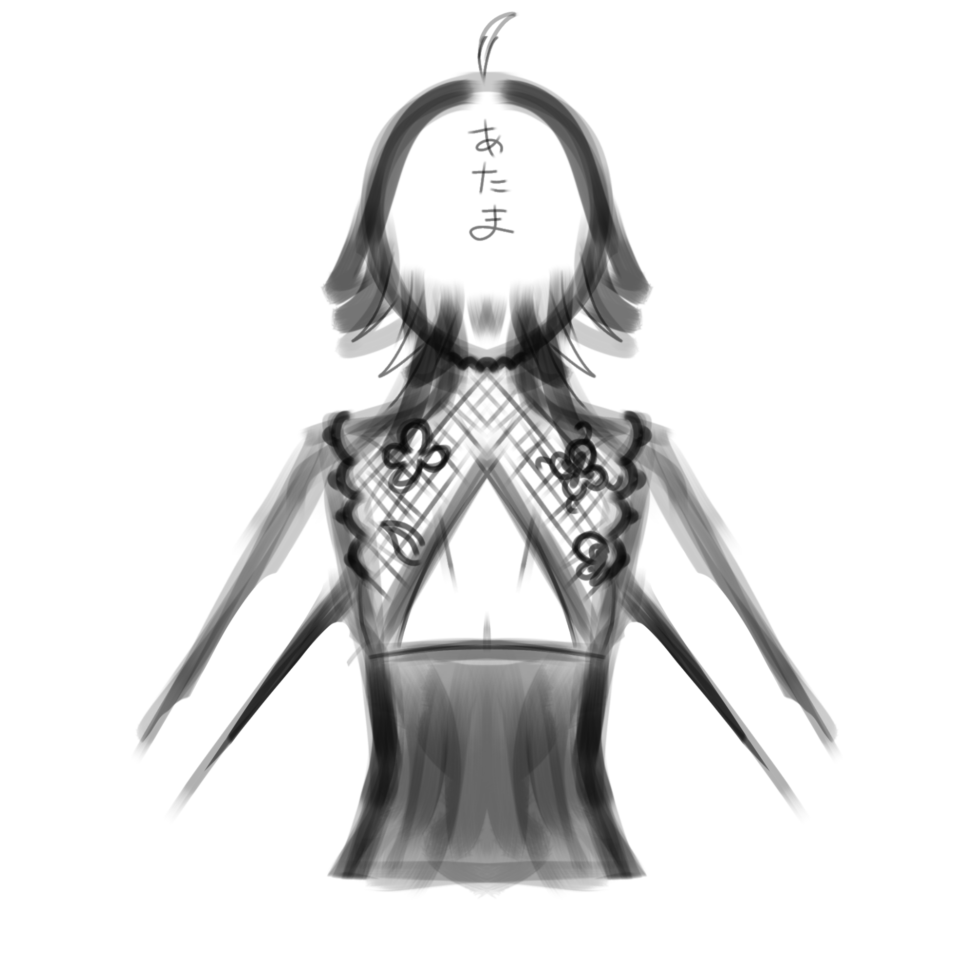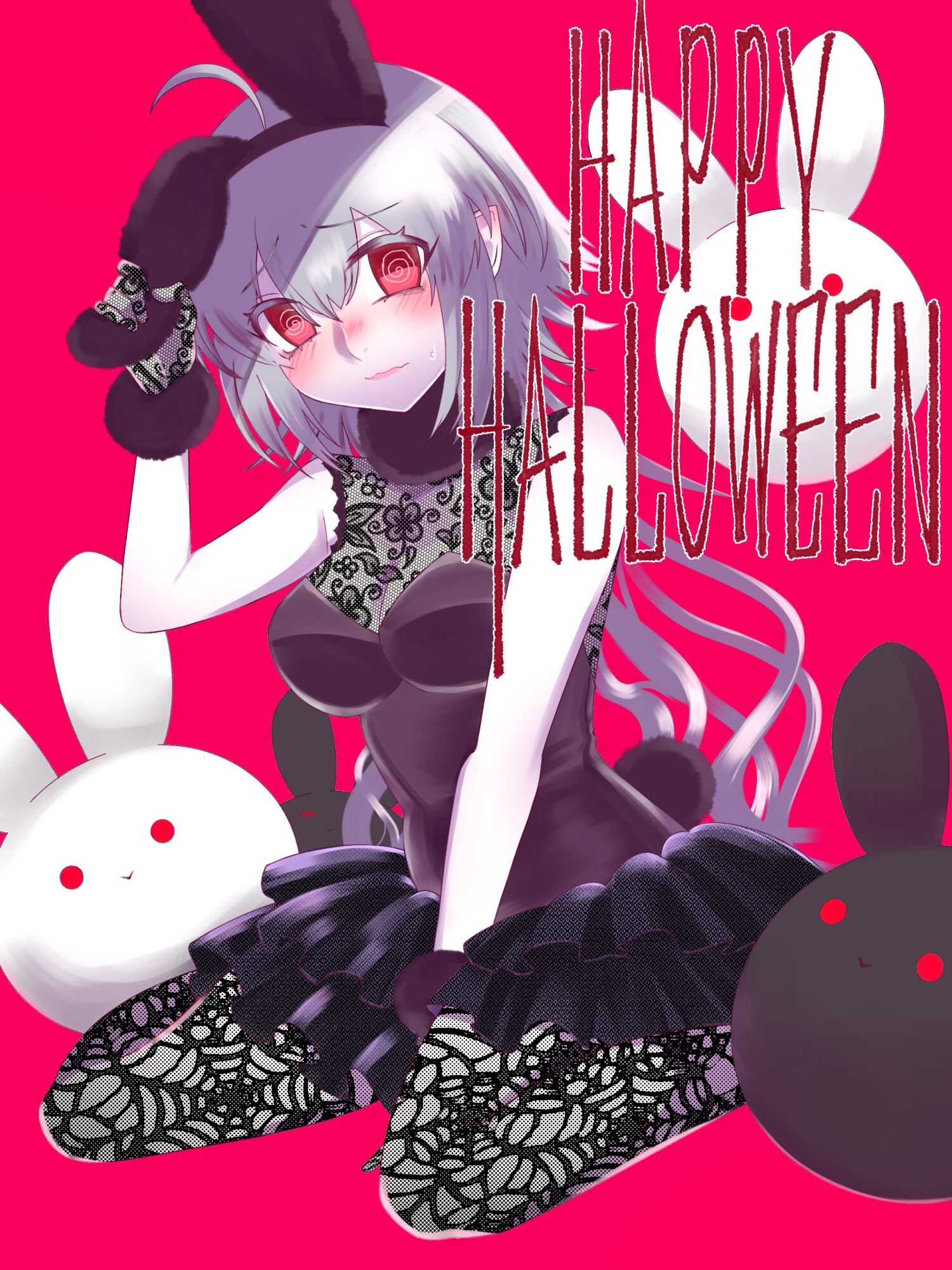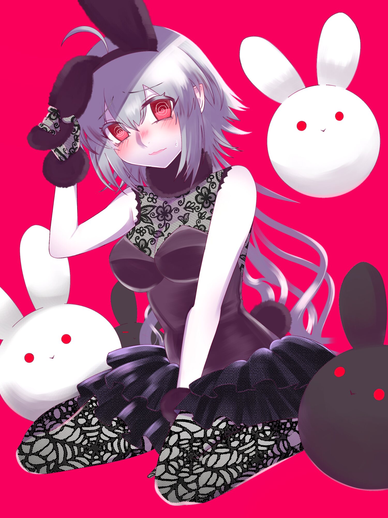 お腹あたりはちゃんと隠してくれてる部分も、どこか見慣れない布地でつるつるしてる。なんだなんだと身体のあちこちをペタペタさわってみると頭の上でふわふわと揺れる柔らかいものが二つあった。つまんで目の前まで持ってくると、もっふもふのうさぎ耳のように見える。
