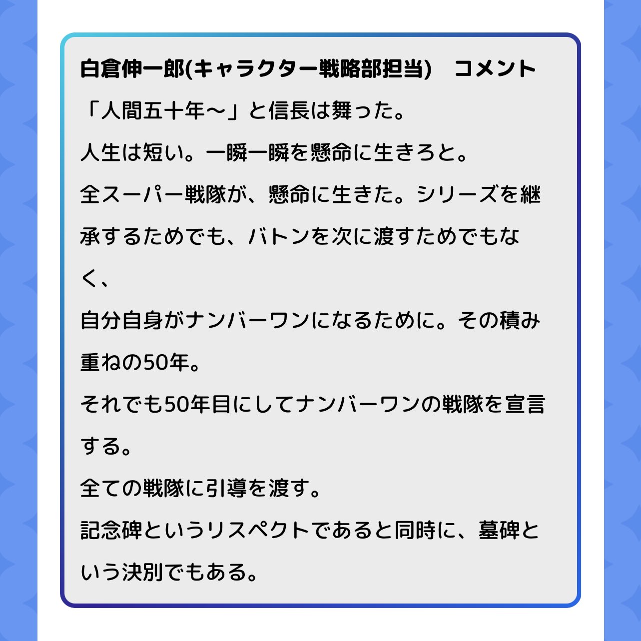現状、テレ朝での放送が終わるかも?程度の情報しかないからテレビ放送じゃなくて完全にネットコンテンツとして展開していくみたいな可能性もまあありうるよね。特撮の歴史に幕を⋯⋯半世紀