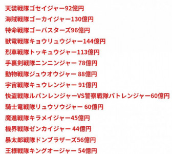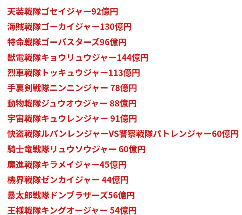 あと全員集合が基本なため、ライダーみたいに主役不在でスピンオフを作るってこともほぼ無い、海外展開も今は無いで1つの作品から生み出せる利益が少ない>>890