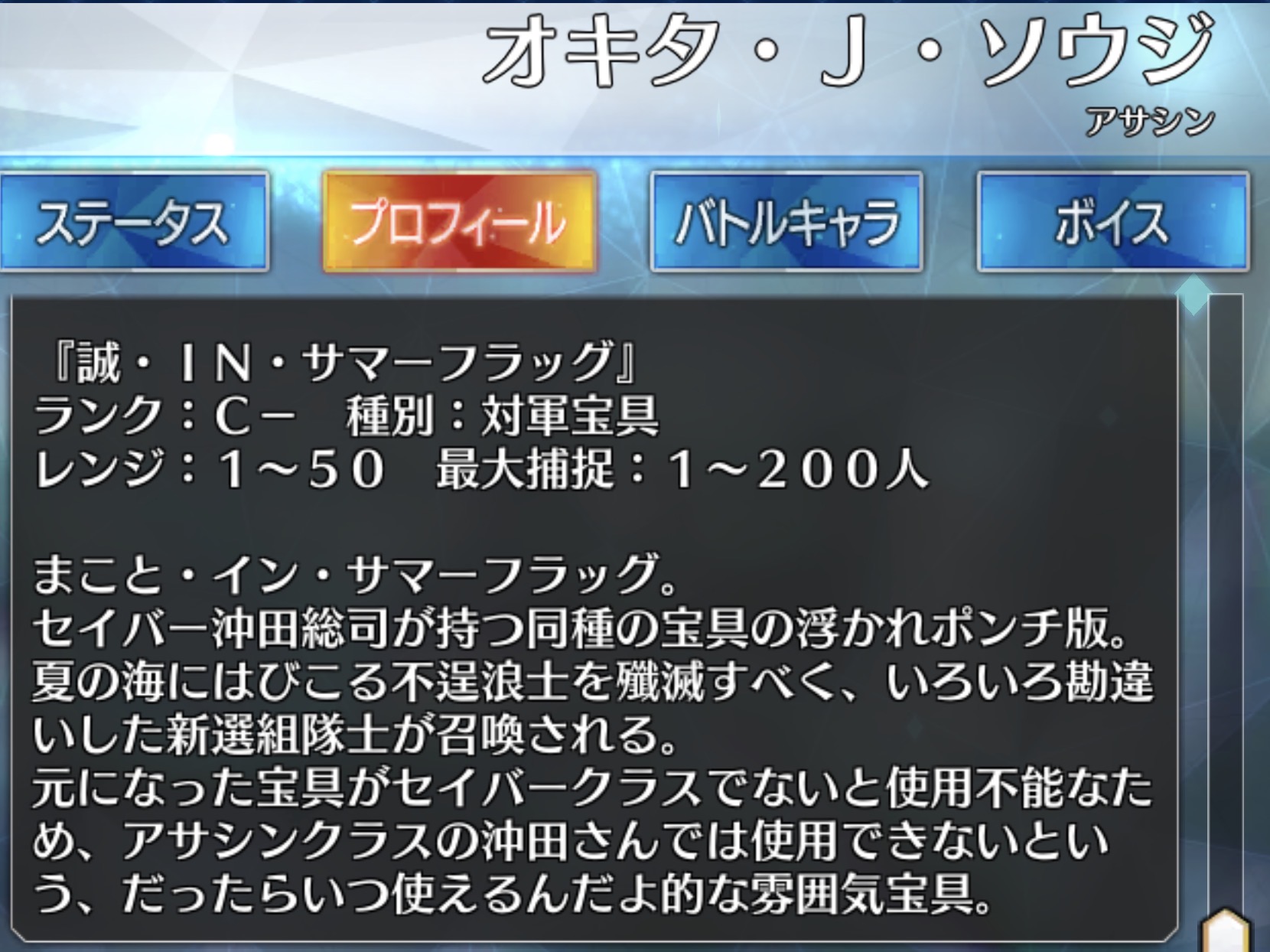 エミヤなんかは英霊はマスターが制御するモノだと語るし近藤勇の話をしよう。君も知っての通り新選組の局長として日本では屈指の知名度を誇る人物だ。ちなみに勇は通称で本名(諱)は昌宜(まさよし)なんだけど知っていたかな?天然理心流四代目宗家で剣の腕も有名だね。池田屋での奮闘は私も見ていて思わず興奮したものさ!!