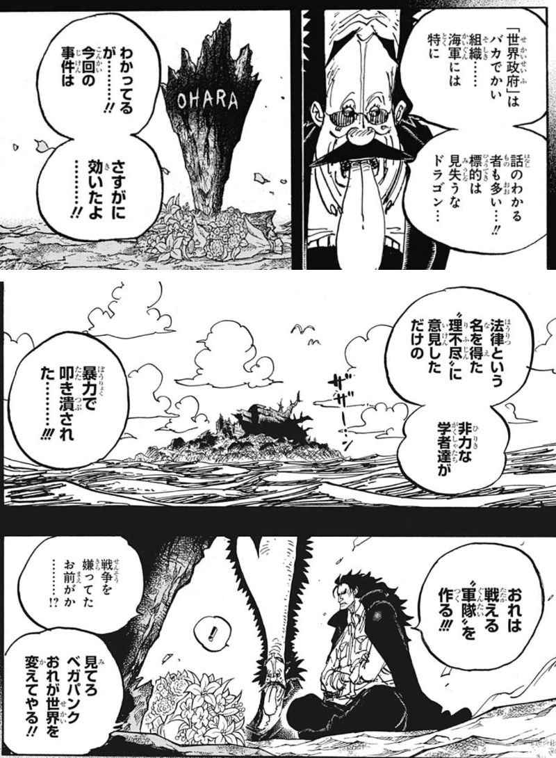 異能や古代技術による暴力が頂点にある世界では民主主義も難しいよな…海兵の正義と民間人との意識のズレって既に世界会議の時にルルシアで海賊が襲われた時に海兵は王族は守るがお前達は守らないと描写されているし。Tボーン中将がクロスギルドの最初の犠牲になったのであの民間人の為に身を張る海兵が守ってる民間人にころされたから海兵はこれから誰が犠牲になっても納得がいくんだよね。既に導火線に火がついてる状態という仕込みがオダ聖は人の心案件