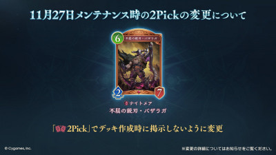 しかし自分でデッキを組む通常のルールならこんなカード出してる間に盤面で劣勢になって圧殺されるのが常なんだが今回禁止されたのは2pickなんだ。これはランダムに提示されたカード4枚から2枚を選んでデッキを組むルールでバザラガへの対処手段が極めて限られるので禁止になった次第だ>>874