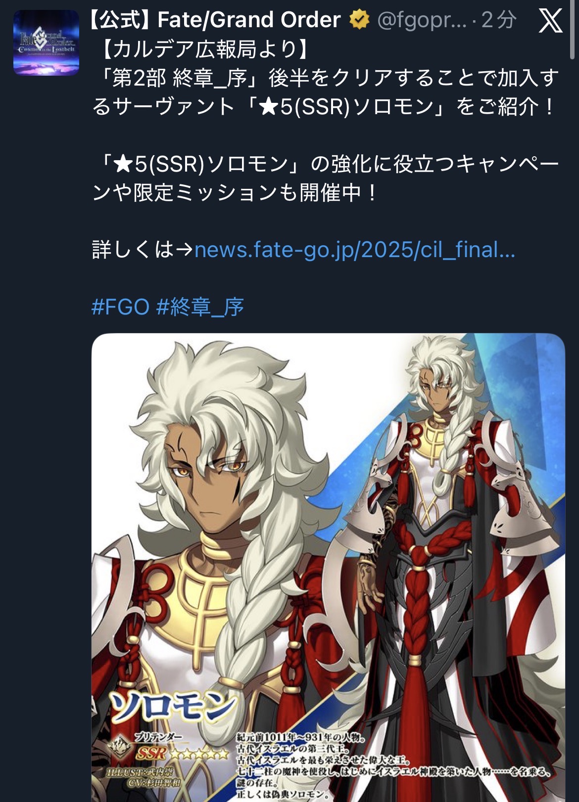 杉田さんの 懐かしい キョンのような感じが良いソロモン王爆速でLv90まで上げたけど、最終臨で少し柔らかな声色になったのちょっと感動した。