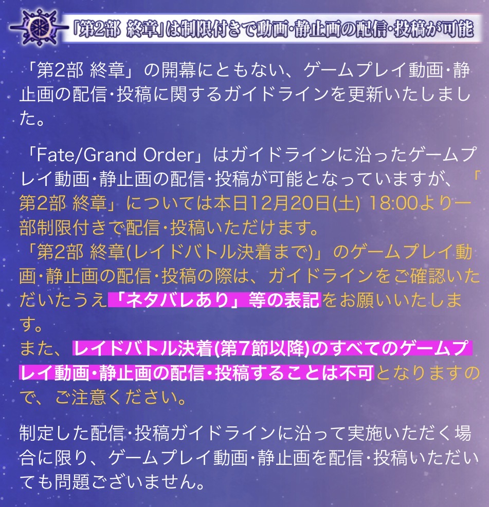 【FGO】「第2部 終章」の開幕にともない、ゲームプレイ動画・静止画の配信・投稿に関するガイドラインが更新 : でもにっしょん https://share.google/OaTIZFiIfVAWKSyNU