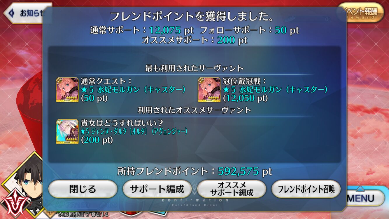 かまちょなんて着てないし。黒聖杯持たせてるウチの妻がかつてないほどフレポ荒稼ぎしてきてるから今回の火力需要は高いんだなって