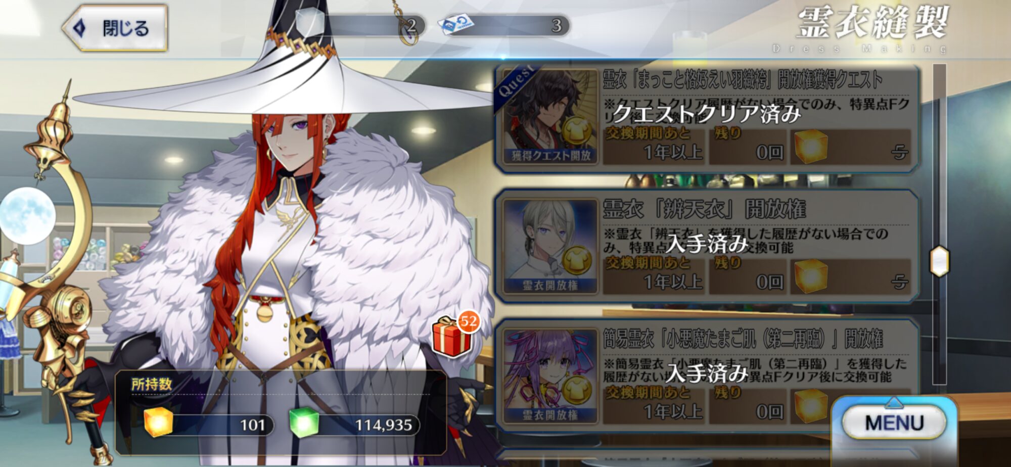 ショップの霊衣縫製からこれを入手すると照れ顔と言うか困り顔みせてくれますわよレイドが控えてるから周回は125箱でストップだ