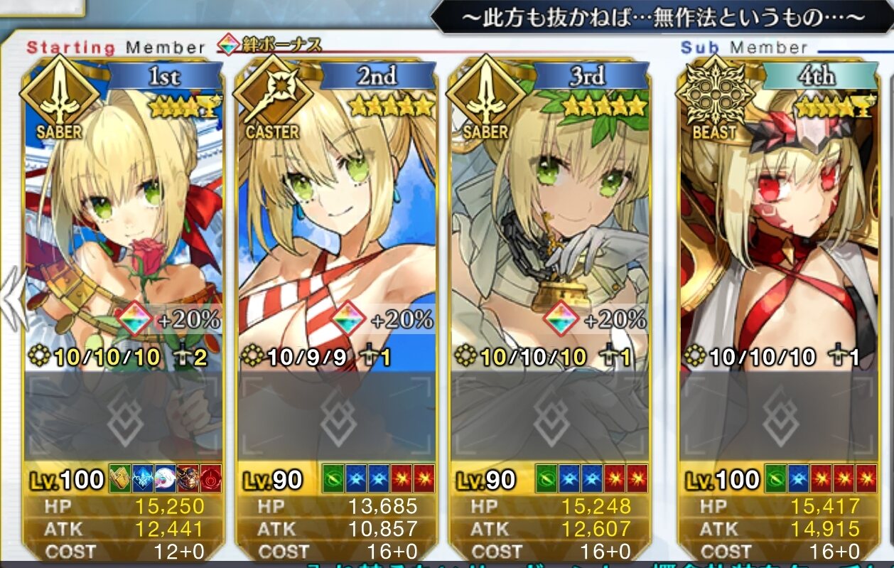 ネロシリーズのそれぞれ違う形態の果実。ああ実に桃源郷なりや……(サムズアップ)結婚したい女性キャラはエレちゃんとマシュと所長なんですが、このメンバーだと仲良く分けられそうな感じがしますよね(なにを?)