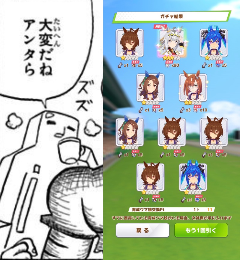 そりゃそうだ そしてBSS松田ウマ娘でガチャ更新の情報がなく明日はヤンジャンの発売日これは日付変わった後に新衣装オグリの予告が出そう