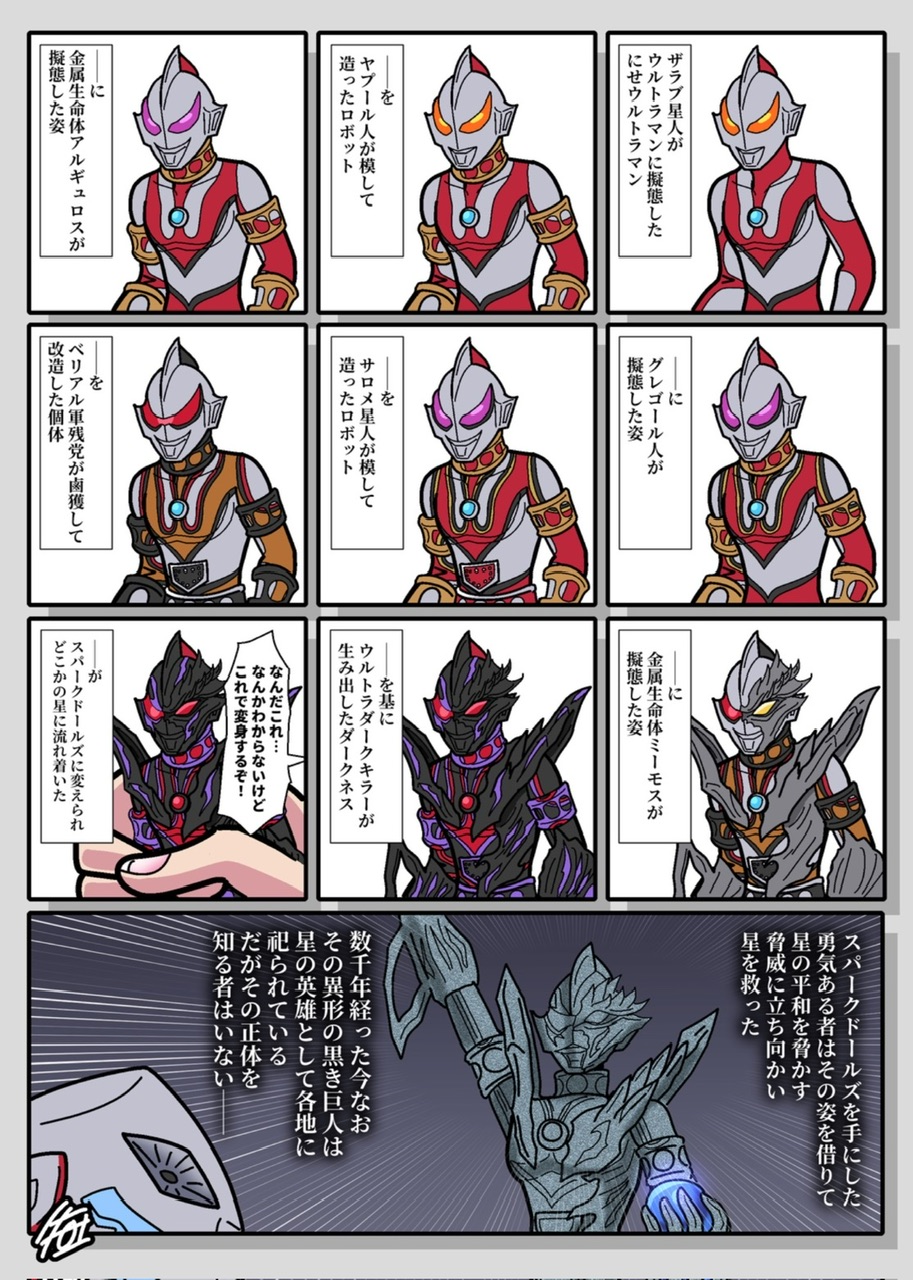 これ「ネオフロンティアスペースが類似品の残骸から再構築した機体(テラノイド)」と「その遺伝子を持つ人間がジードライザーで無理やり変身した姿(ジード)」と「その遺伝子を借りて変身した姿(ベリアル融合獣)」と「そのクローン(ニセベリアル)」と「それをモデルに開発した特殊空挺機構(ウルトロイドゼロ)」も入るのか