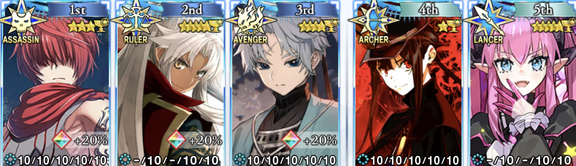 究極完全態といつか究極完全態にしたいと育てているサーヴァントたちです。宝具レベルとアペンド解放が本当に大変です。アーサーはビーストと関わってるけど、武蔵ちゃんと同じでFGO世界の住民ではないっぽいからなぁ