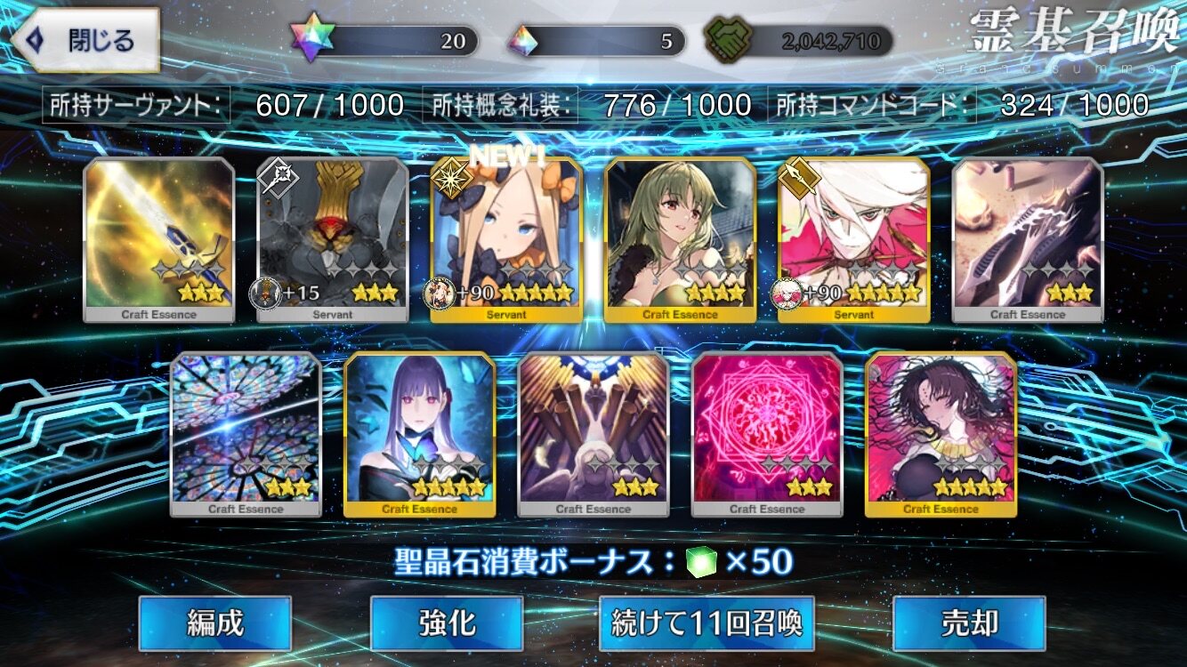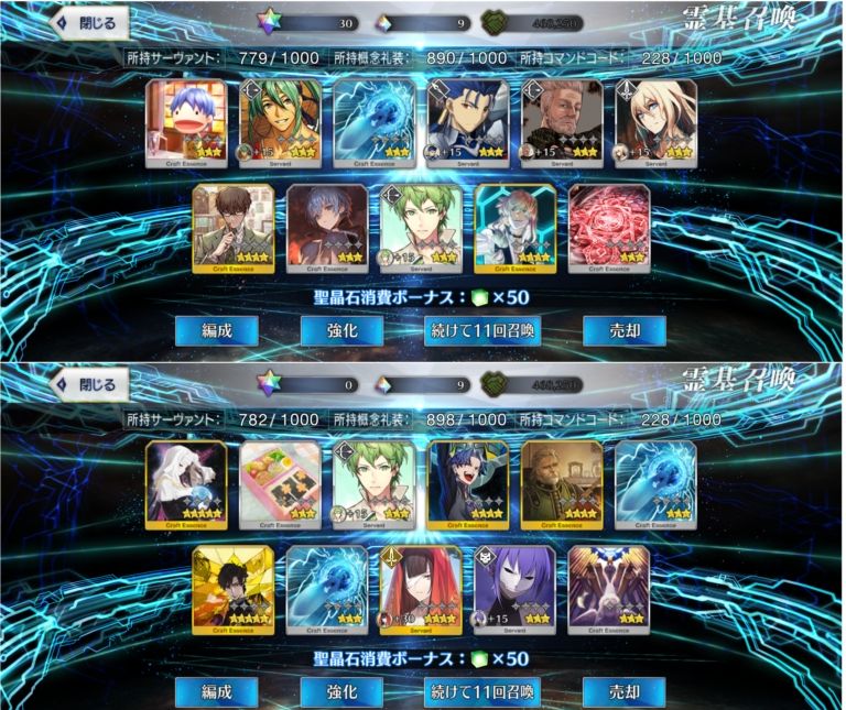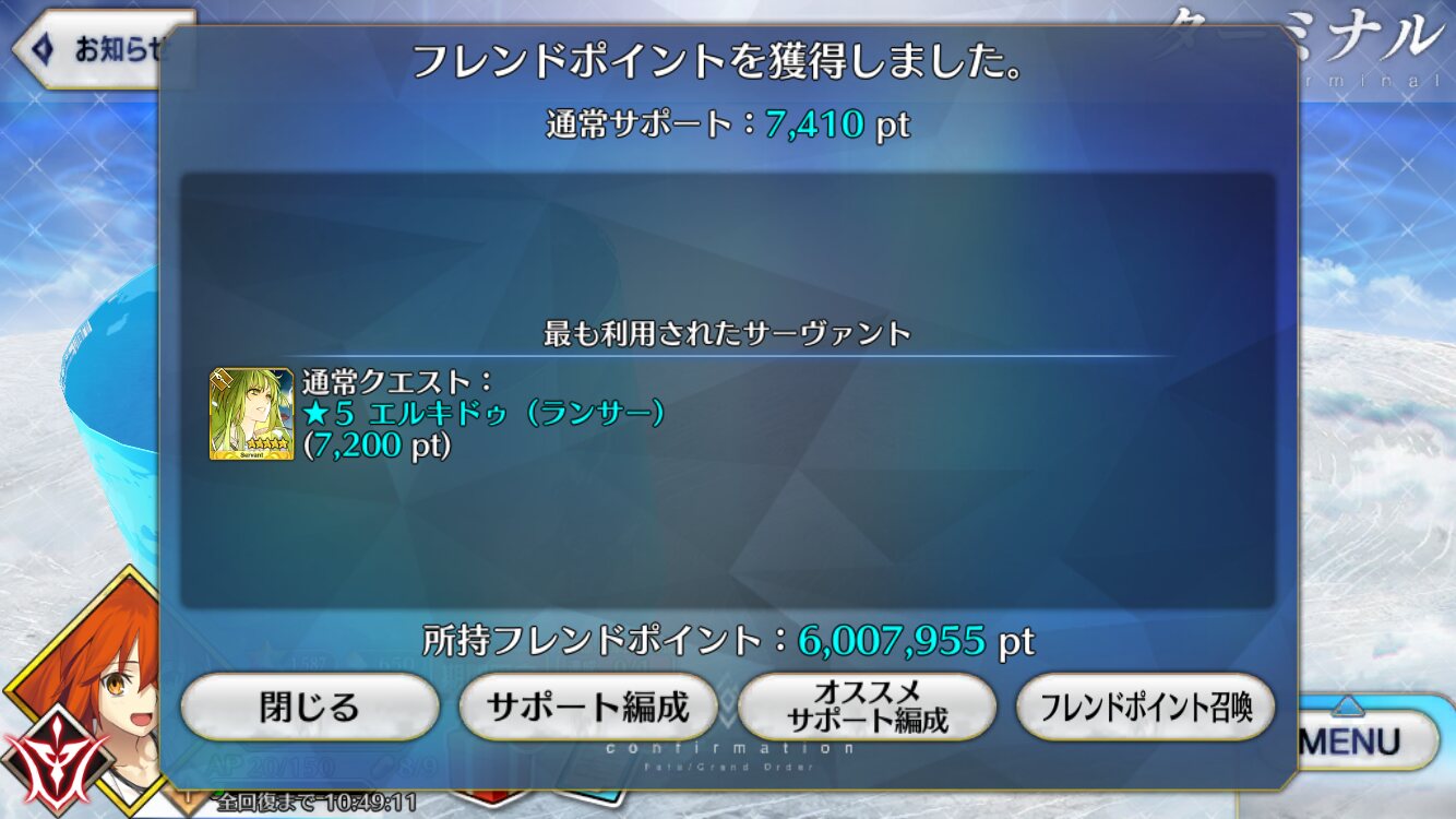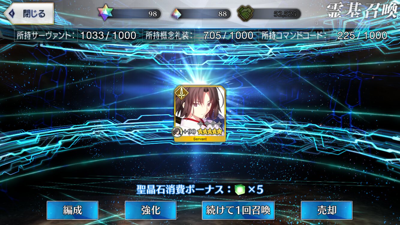 お迎えチャレ成功するの本当に羨ましいですわ……運分けて欲しいぜ!(こないだようやく初4でもある☆4エリちゃんが宝具5到達した)(誰もいなさそうだし、900取るか)