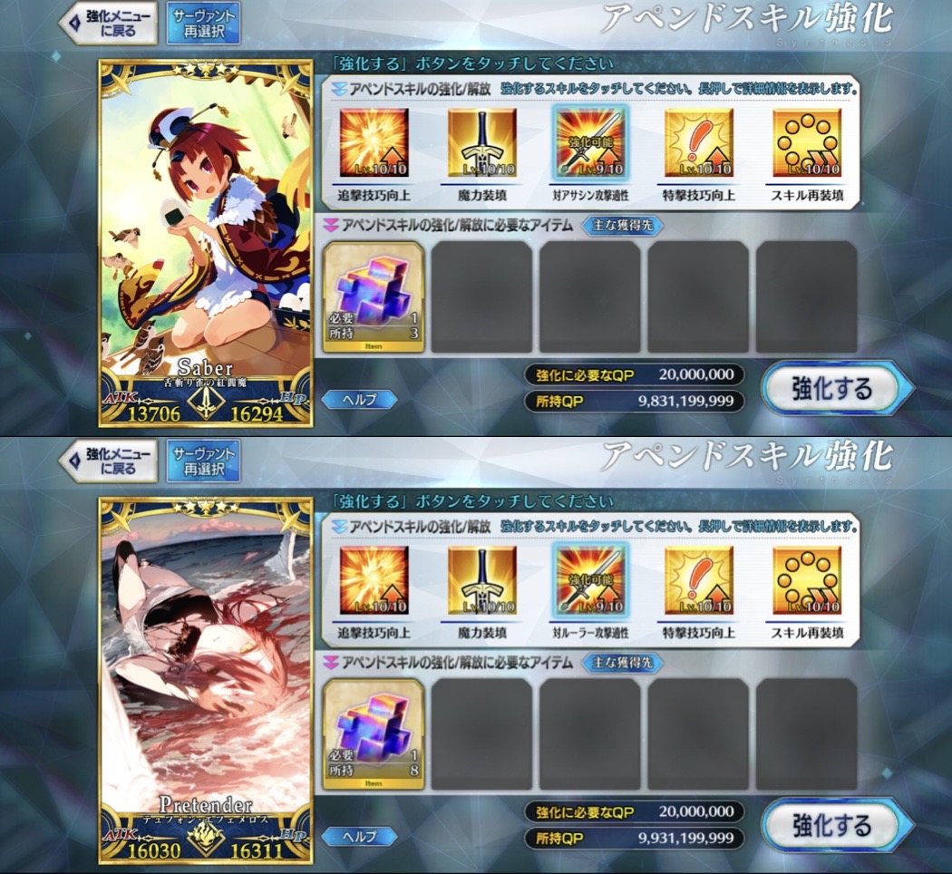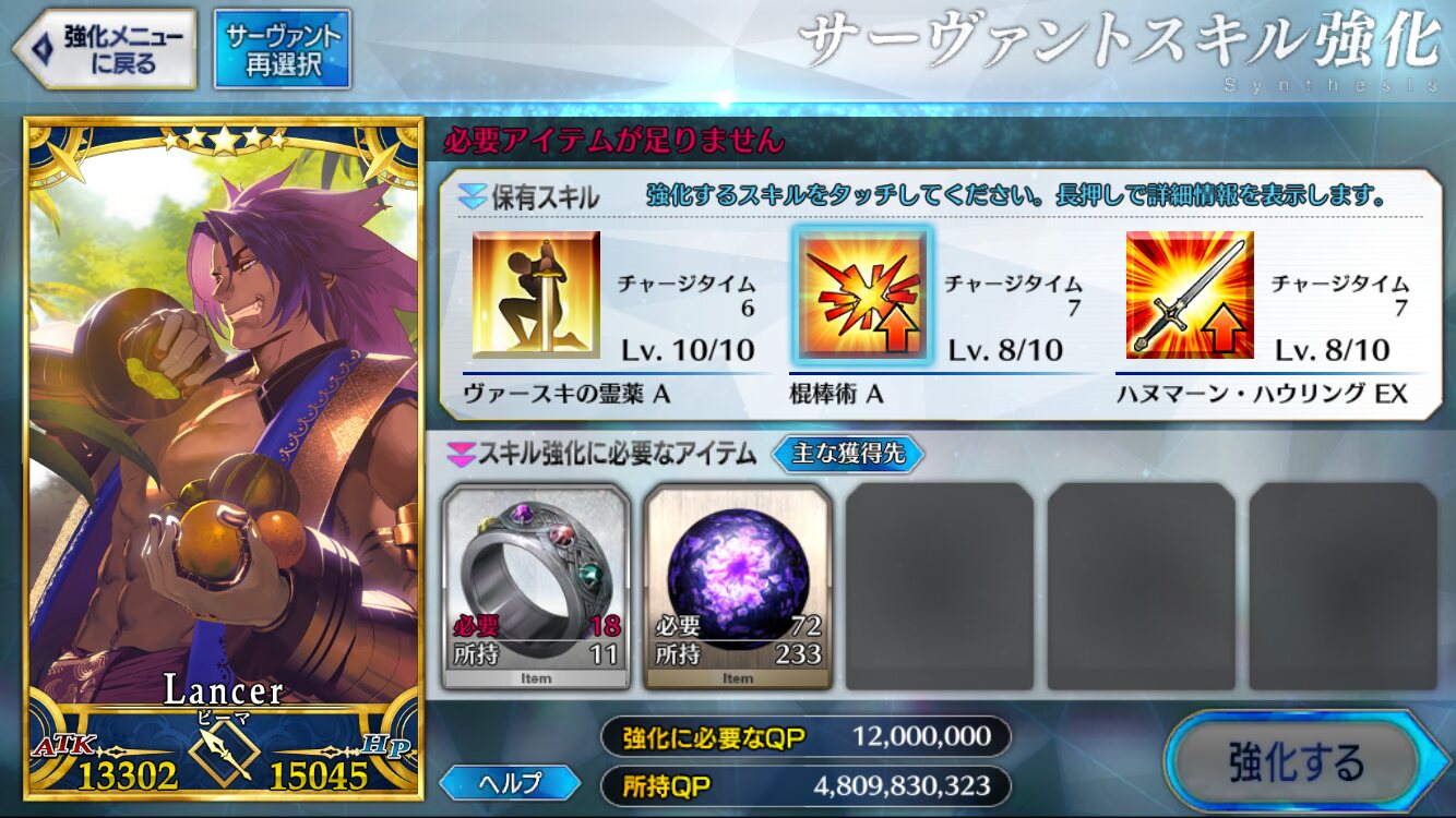 わかるわ。スキル類も基本最大にするから一気にあげさせてほしいわ。画面ペチペチ叩きなくないし、素材足りない時だけ教えて欲しいわ(血涙とか骨とかはナタデココ在庫切れで足りてない)ログレスさん来るかもしれないし
