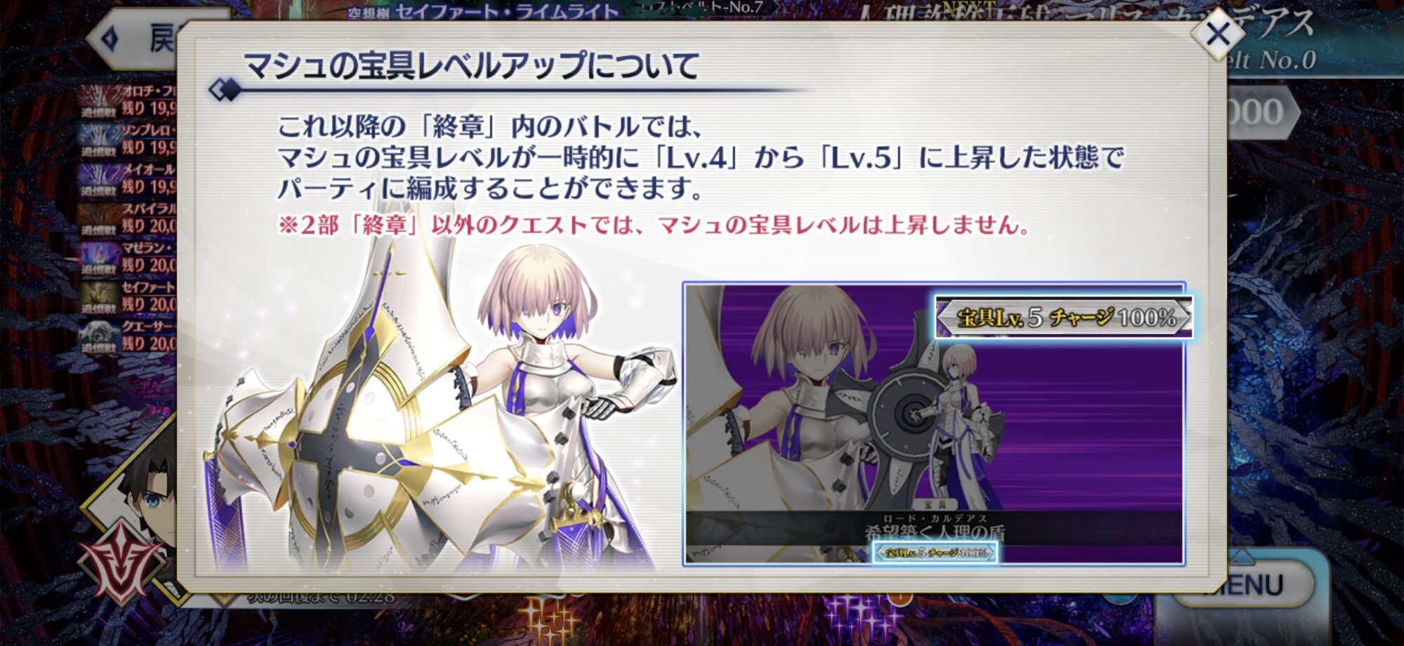 なんとなくだけどマシュの宝具レベルが5に上がる時は本当にFGOのサービスが終わる時な気がする、そこがゲームのユニットとしてのマシュの最終到達点になるんだしラストバトル アイドルの卒業公演みたいでワクワクした