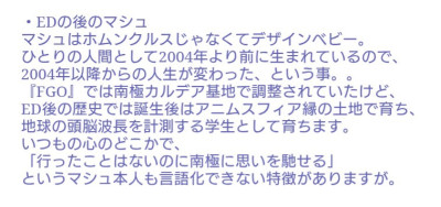 それぞれの章の担当が書いてるらしいしオルガマリーお姉ちゃんとワイワイ過ごした時間ぎあるマシュifの可能性を抱いて寝るです。ifっていいよね、救いがある気がするから