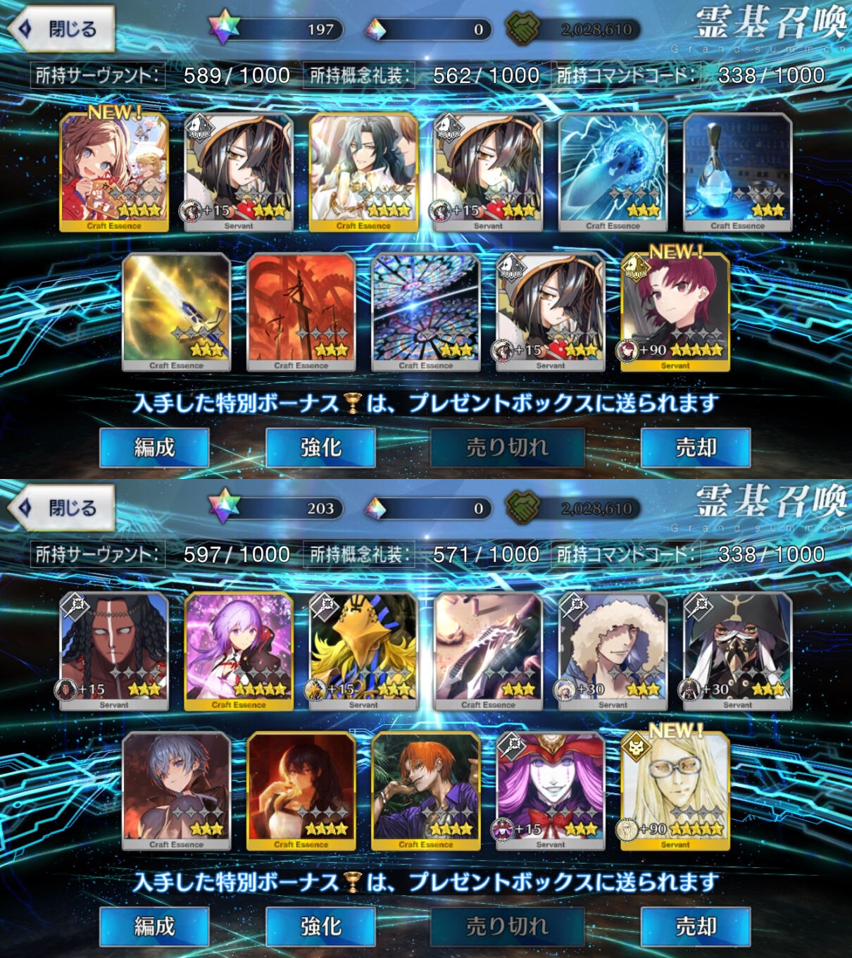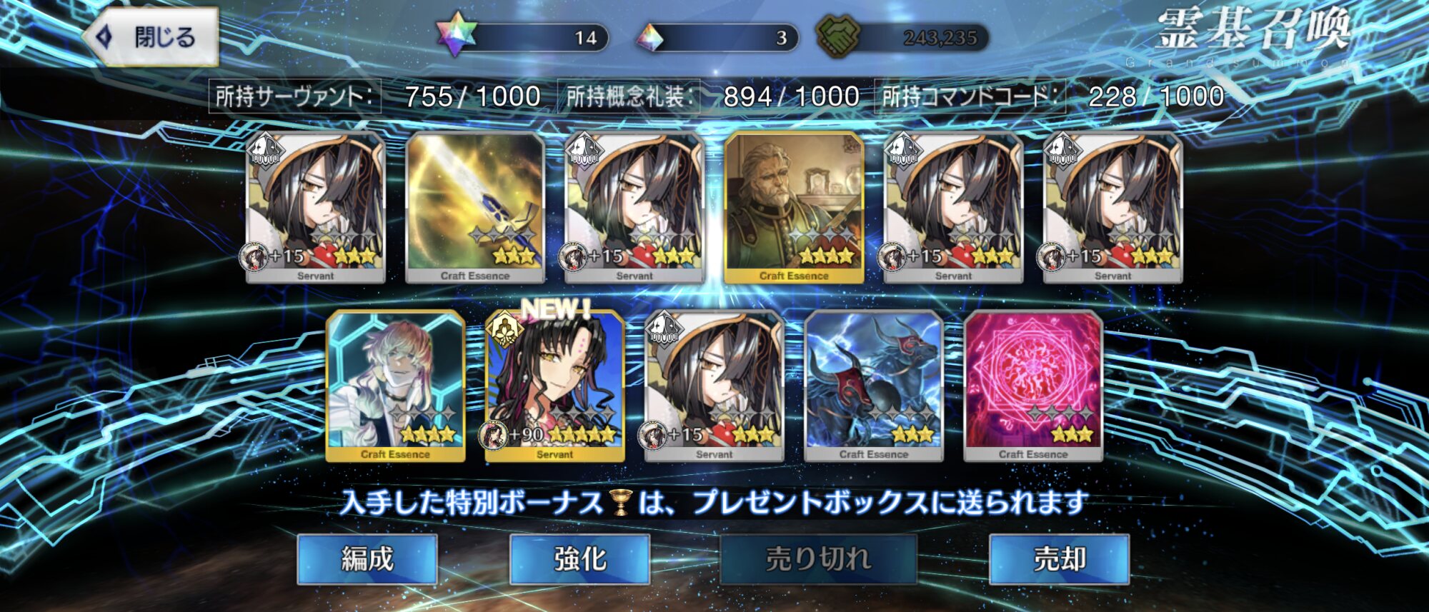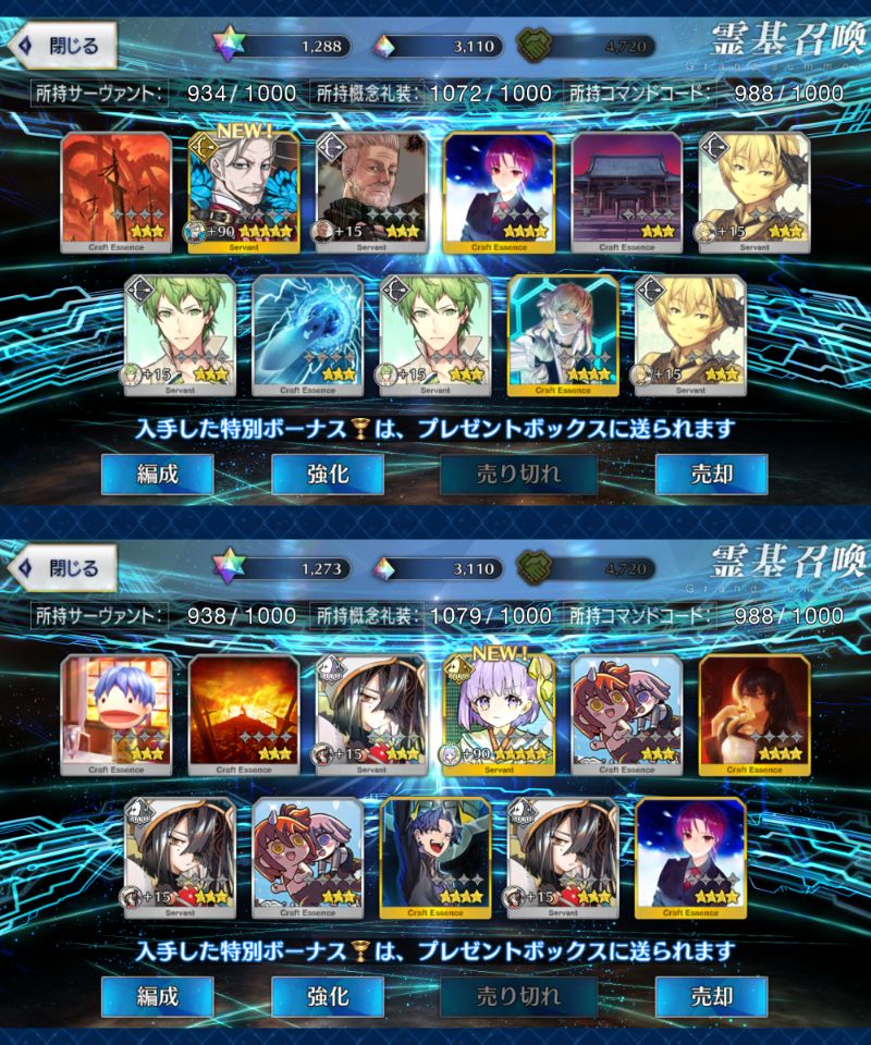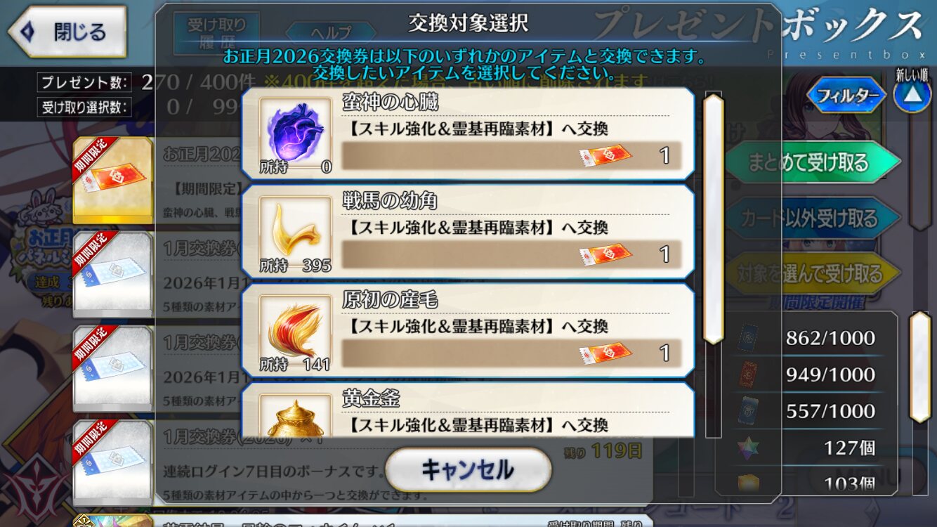 FGO開いたら素知らぬ顔でマイルームが正月仕様で戸惑いましたが、先が何も分からないということは良い意味でもう何があっても不思議じゃないということ。そんな前向きな気持ちで今年も頑張っていきたいと思います。とりあえず育成と在庫整理かな……まぁリアルのあれこれ終わらせてからになりますがロードログレスさん、これヘラクレスとか綺礼とかの強化パーツか……?