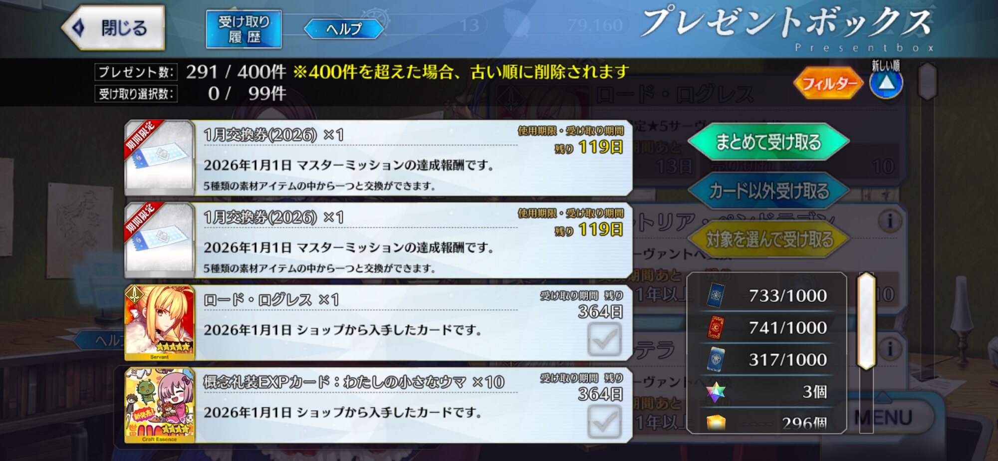 今ならお正月交換+1月交換分の2つあるし。フレに早速宝具5ログレス冠位にしている人がいるのこわい