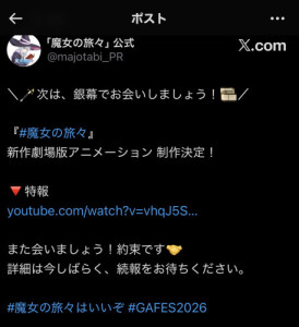 本命にキスしたら慣れ過ぎてて打たれた男ほー。魔女の旅々の新作アニメで劇場版か