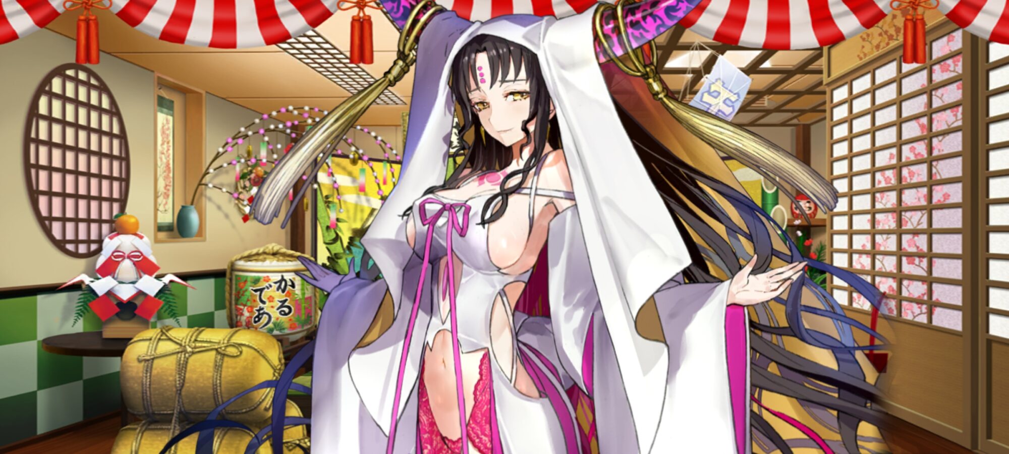 宝具は事前に無敵貫通が付与される人類の脅威特攻全体B。副次効果は味方全体に3Tの攻撃力アップとNP20チャージ、CT1短縮、HP回復と至れり尽くせり縁起物