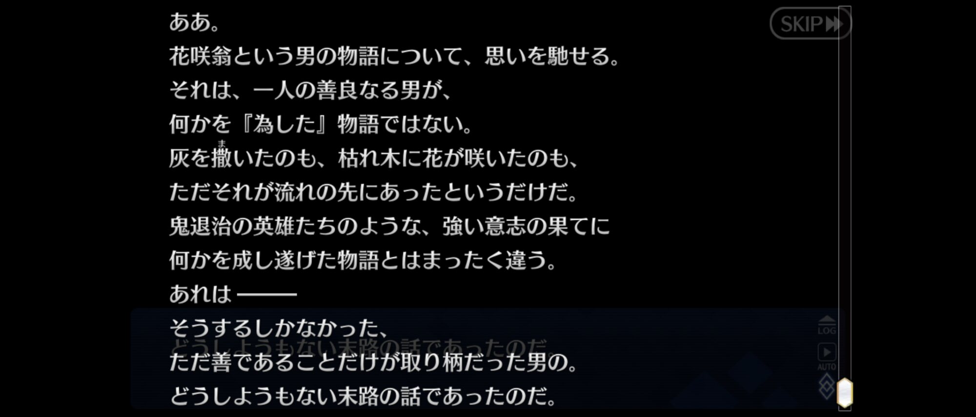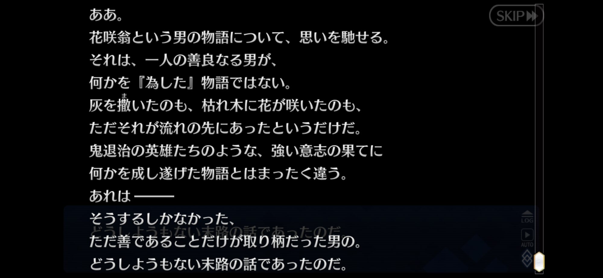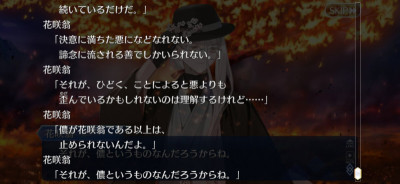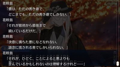 自分のことが肯定できないなら、そりゃ世界とか人理とかどうでもいいよなって納得した。実装イベで味方側から心のこもった丁寧で論理的な批判を受ける花咲翁…
