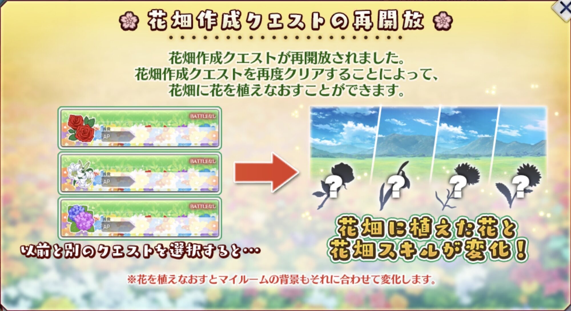イベントは今日の昼まで…花畑クエストは念のため一通り見ておこうな!