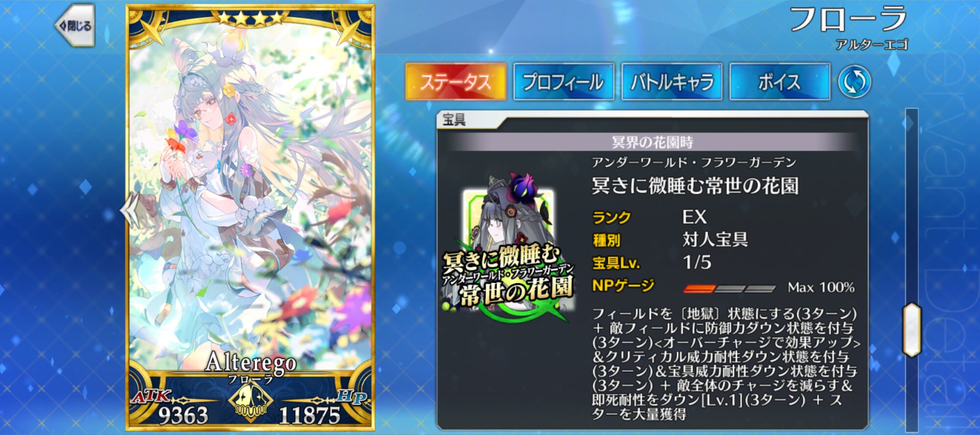 敵にせよ味方にせよ、世界より大事ななにかを選ぶだけの感情や熱持って動いてるキャラクターは見てて気持ちがいいフローラの性能改めて確認したが、フィールドにバフデバフ付与って効果面白いな。刑部姫とかコンスタンティノスとか宝具で建築する鯖も今出たらフィールド付与だったかもしれないな
