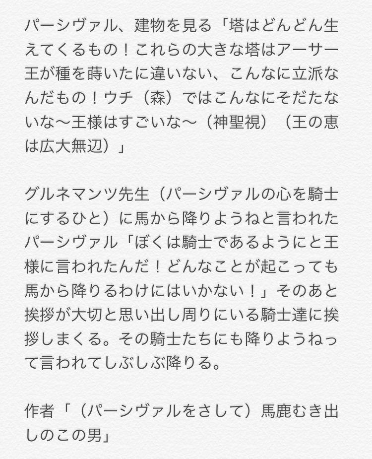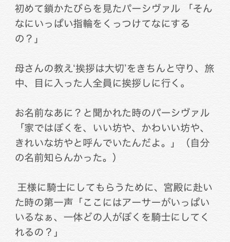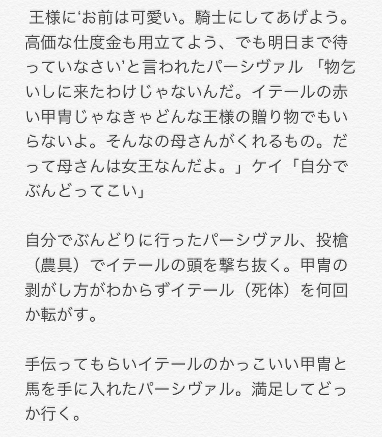 パーシヴァルの父親は、ペリノアではなくガハムレトっていう話で行けば闇深くなくなる。パが身元不明で怪しかったけど戦力になりそうだから、ペリノアがその場のでまかせに俺の息子発言したとか。