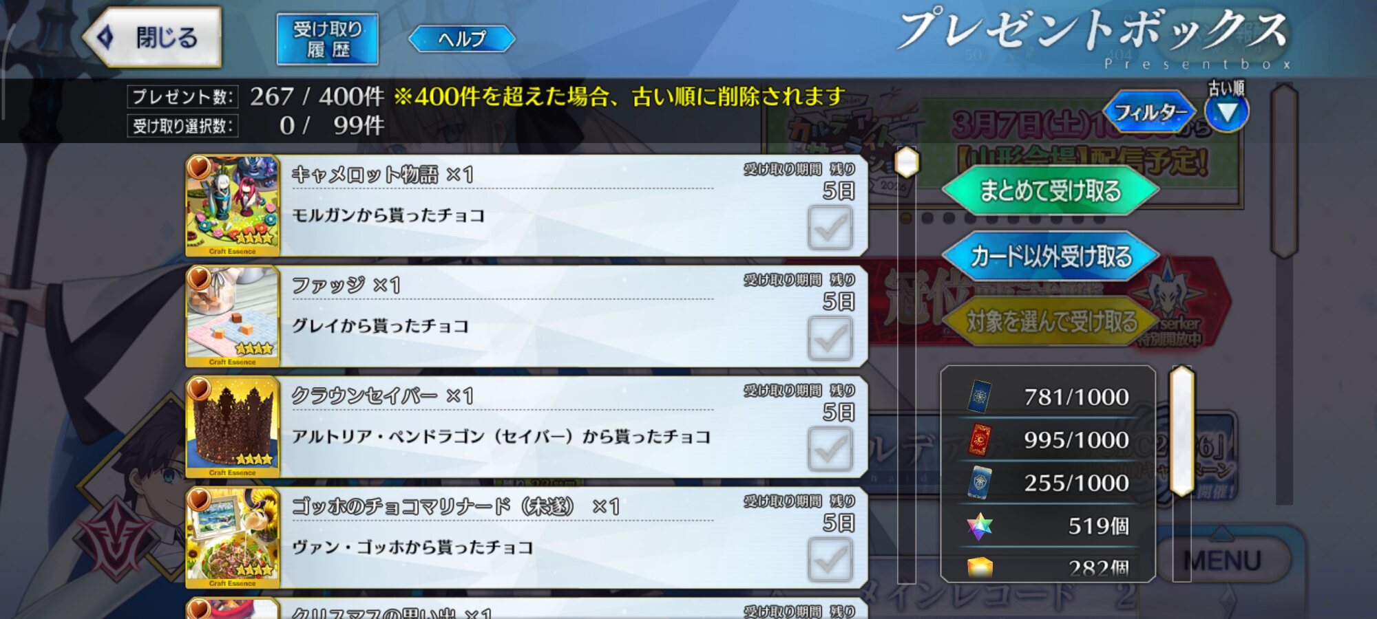 一年間鯖を入れっぱなしで忘れてて消えかけた事ある。ごめんねベディ、フフフ......それもこれも去年の私が優柔不断にもチョコ礼装を消化しなかったのが悪いのです