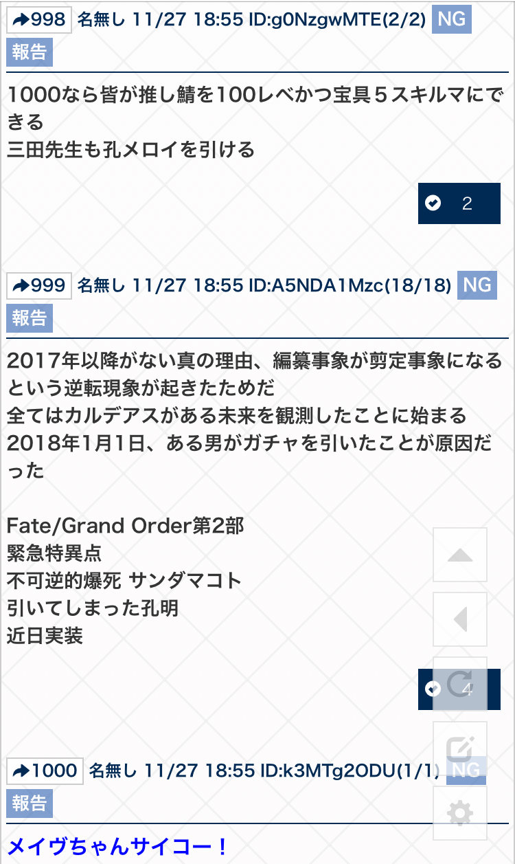 前スレの1000はこれは、・・・・メイヴちゃんサイコー!凝っちゃうと1000取れないからね。是非もないよネ