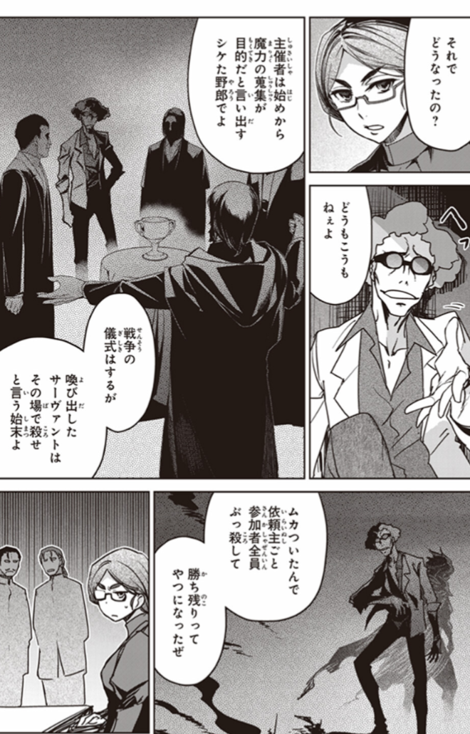 →ナチ、米国、帝国陸軍がかぎつけて介入。しかも戦時中だったこともあり外部勢力の侵入を許してしまい大混乱に。正史では小聖杯が破壊されノーゲームに。Apoでは勝者こそ決まらなかったがダーニックが大聖杯を根こそぎ強奪するフェムの船宴で勝つと願いを叶えられるそうだがフェム聖杯持ってるんかな