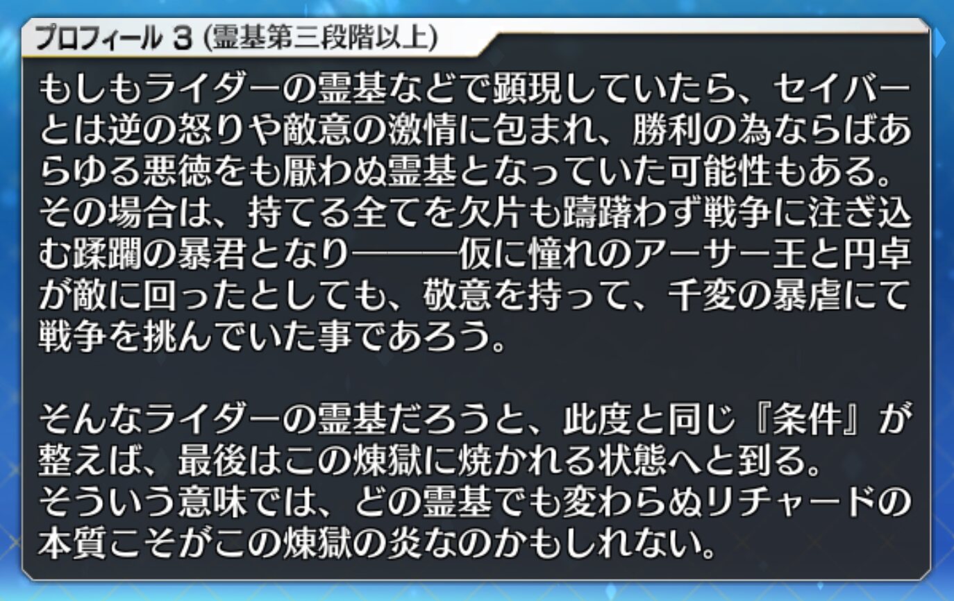 三臨霊基のリチャードマテを見る限り「敬意をもって千変の暴虐を使い円卓と戦うだろう」とあるので、これは嘲りではなく、敬意を持って言っていますね獅子心王・・・コラボシナリオ、もしかして6章執筆当時から構想あった感じなのかなあ。