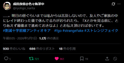 一応FakeとFGOはそれぞれリンクするネタはあるんだけど、第六特異点に限定するならそれこそ偽リチャードぐらいしか縁がないのよね。ぶっちゃけグガランナとかのほうがよっぽどラインは辿りやすいだろうし。これはサバージオスみたいな感じで、ジャックちゃん(CV堀内さん)的な簡易霊衣を期待してもいいんですか!?