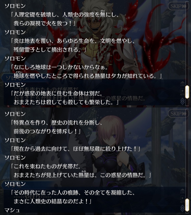 魔神柱は確かに人を大きく上回る存在だが、事ここに至って結局悪魔であった頃の人の願いに寄生する形でしか存在出来ないという性質を棄てられていない。だからソロモンの肉体に寄生せざるを得ず、その名を騙る事でようやく存在し続けたと。ある意味その無様さへのコンプレックスが創世光年を計画させたと言える。