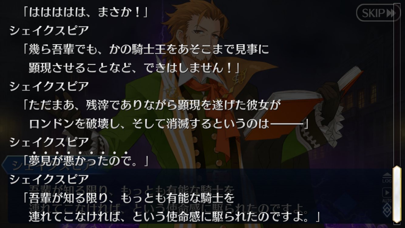 あと必要な素材は余りがちな血の涙石と最近採りやすくなった羽だけだし。今更ランスロットの幕間やってたけどシェイクスピア良いキャラしてるな