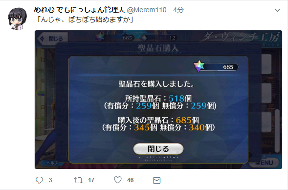 運営の調整は良く出来てると思うよ上乳上やダ・ヴィンチちゃんは決して弱くはないし連射型だからってのもわかるが宝具強化欲しい、強化クエ週間が年始あたりに来ないものか...
