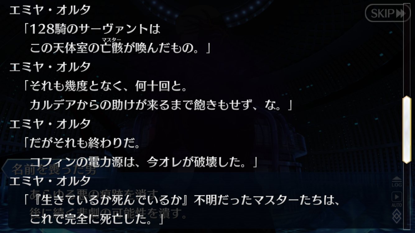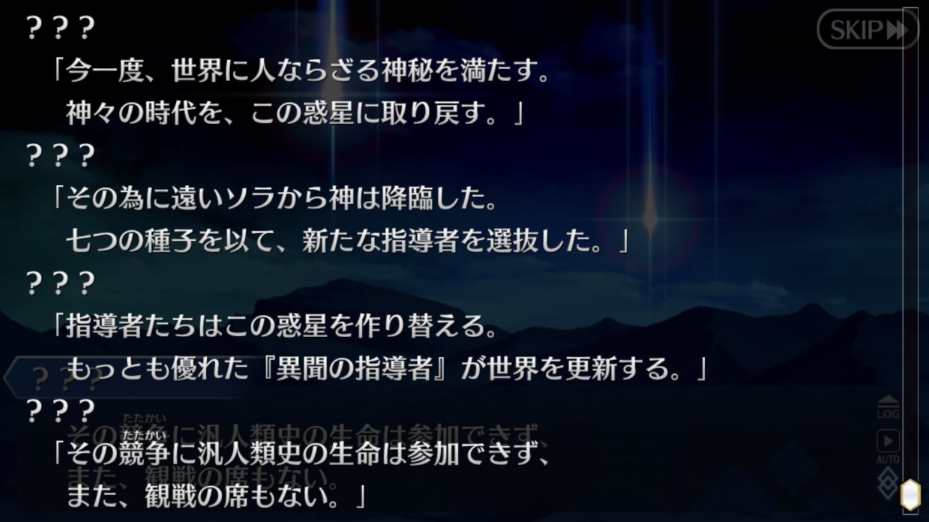 味方につくというより倒したマスターの異聞を滅ぼしていくのではリーダーっぽいキリシュタリアが5つ目なあたり、シナリオの順番に細工があるか、後半2人にでかいネタがあるか、何かしらあるのだ思うのだけれど、どうなるんだろう