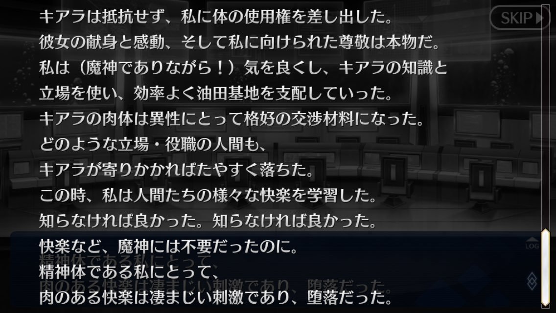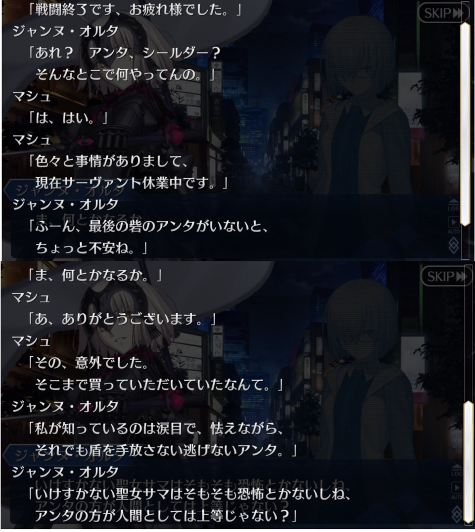 再臨後のマイルーム台詞では祈りを捧げていた台詞が「痛いほど手を握って、それだけでいいの」と変わっていますし、再臨時の台詞であなたの思うままに力を振るってもいい、あなたなら自分と同じ世界に立てるなど神への信仰心よりこちらに依存心、信頼が上回っているように思います。再臨前でも絆4、5では今まで自分を取り巻く周囲に向いていたのが、一転マスター個人に対する好意を表す言葉に変わるのです。
