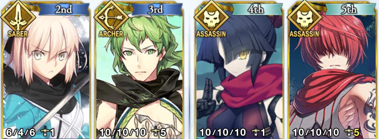 哪吒&エルキドゥ→完全に性能度外視。人工的に作られたものってイメージのペア。性能を思い存分競い合ってほしい。こいつらも回避ガッツ持ちだからしぶとい。Q多めだから片方に封印指定執行者持たせると楽しい
