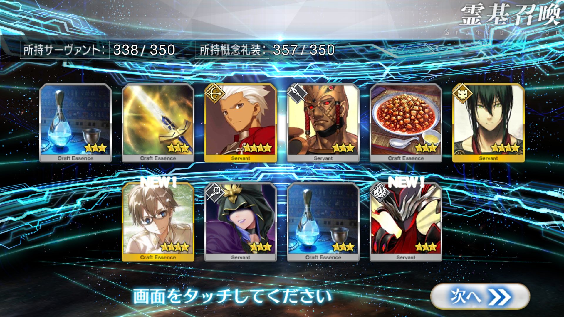 これで星3以下のサーヴァントみんな揃ったし三種のエミヤ盛り合わせパーティもできる!ホワイトシチューを食べる前にガチャを回したら、20連目で師匠2枚引き!