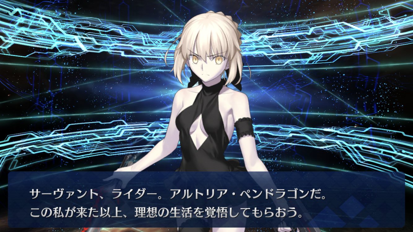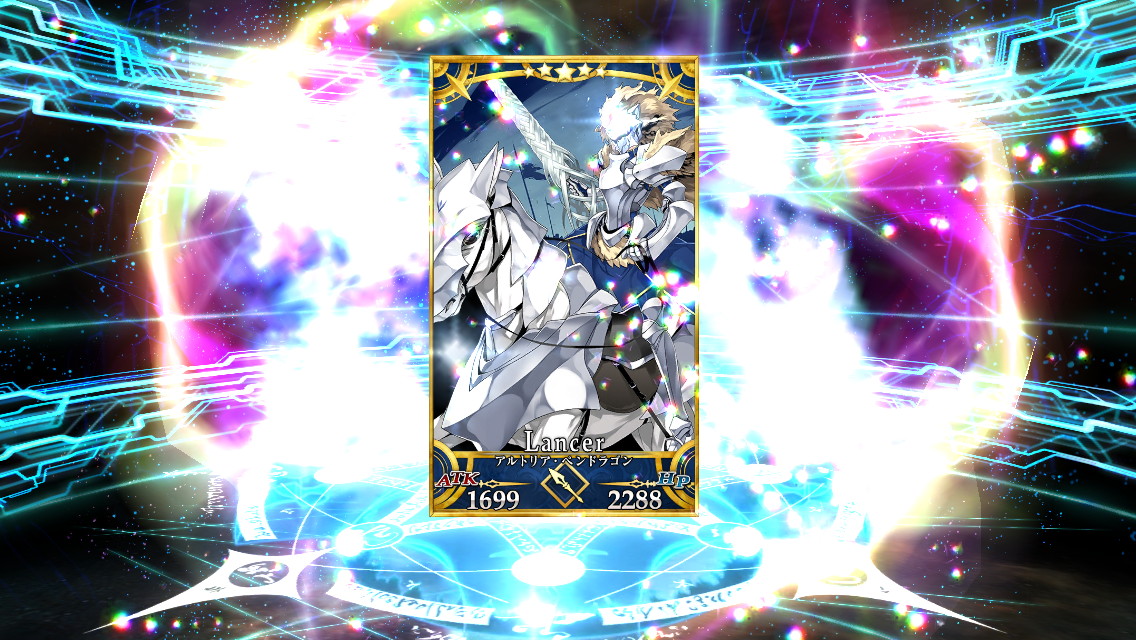 第6特異点PUは回さない予定でしたが>>976を見て、周回性能高いと評判のニトクリスを召喚するチャンスだと気づいたので、様子見くらいのつもりで呼符を使ったらランサーのアルトリアさんがやってきました