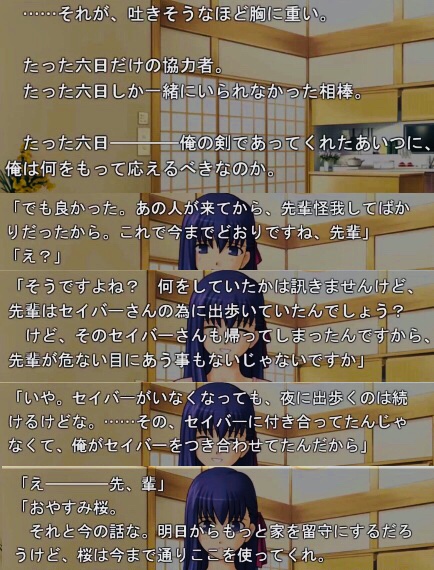 時系列的にはセイバーが飲まれる前だから無いかもしれない。桜の汚い部分も含めて魅力だと思う