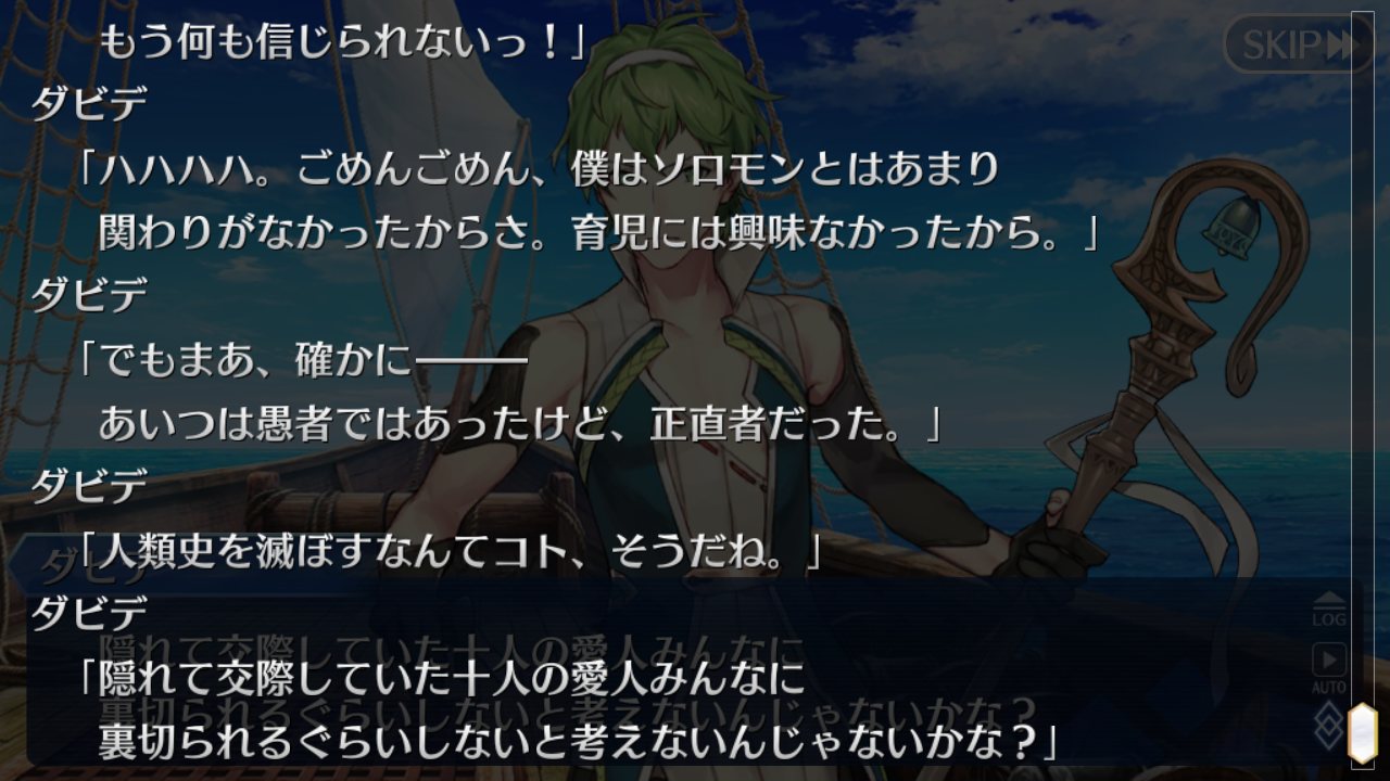 戦いを経て人間全員を成長させたい、だっけ……いかん、もう一回エクストラやり直そ。やっぱりイスラム関係鯖は難しいかね。ハサンもイスラム関係ではあるが、かなり独自設定加えられてるしな。