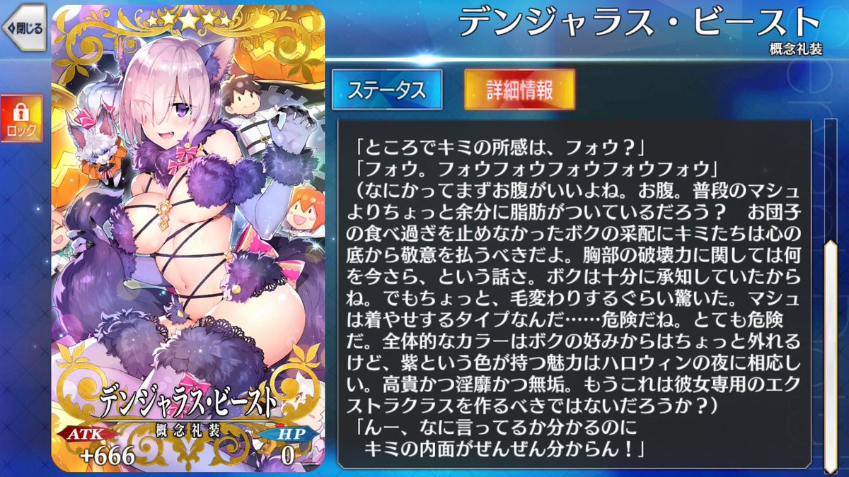 後、他作品のキャラになるけどグラブルのジャミル君にも「訓練していましたから平気ですよ。いくらでも主君からの試練に耐えて見せますよ!」みたいにちょっとドヤ顔な感じのリアクションを返してほしい気持ちがおおいにあるね。ジャミル君は真面目ボケの素質に溢れているからね。ザビ子と玉藻のふたなりックスってどっちに生やしてもザビ子が啼かされそうだけどそういう行為を受け入れてくれるってことが嬉しくて満たされてる玉藻みたいな妄想