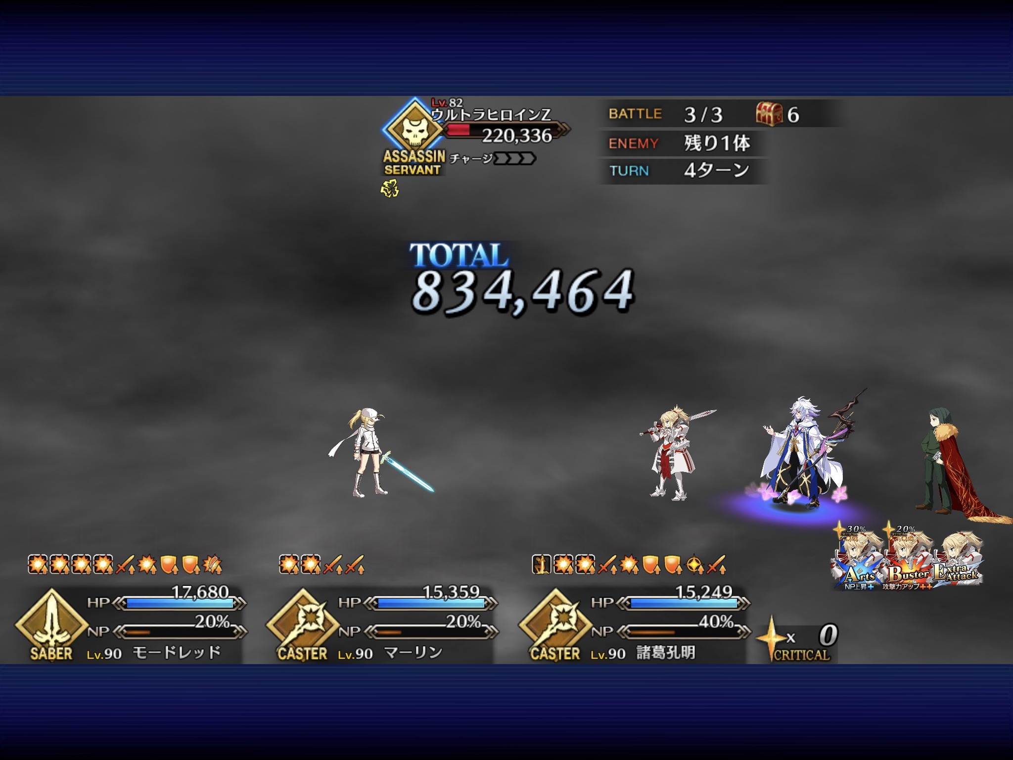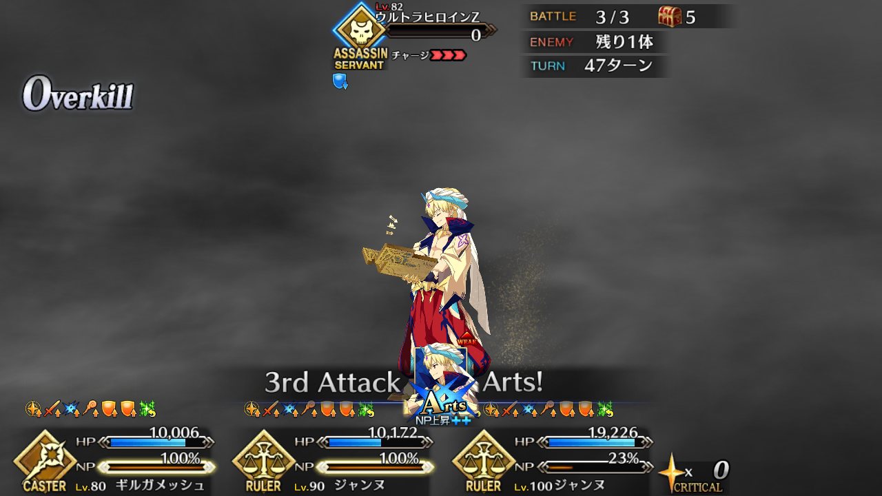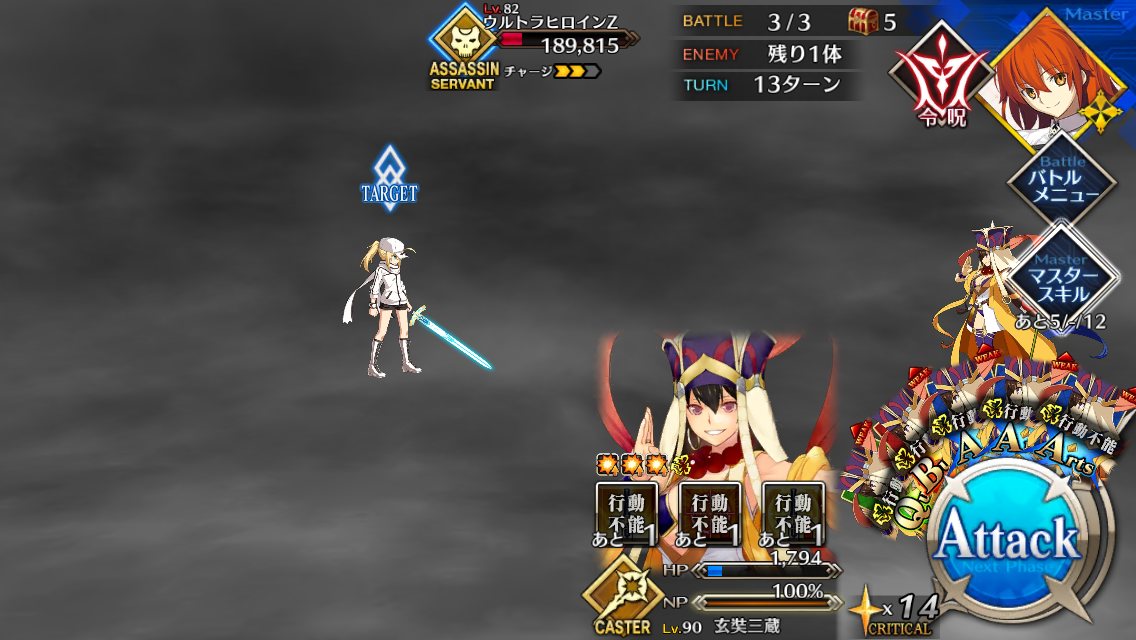 ①ダメージを与えすぎない程度に戦いつつ、ジークのNPをためる(ジークにガーデンオブアヴァロンのものと思われるバフが付いているため、すぐオダチェンはしていない)