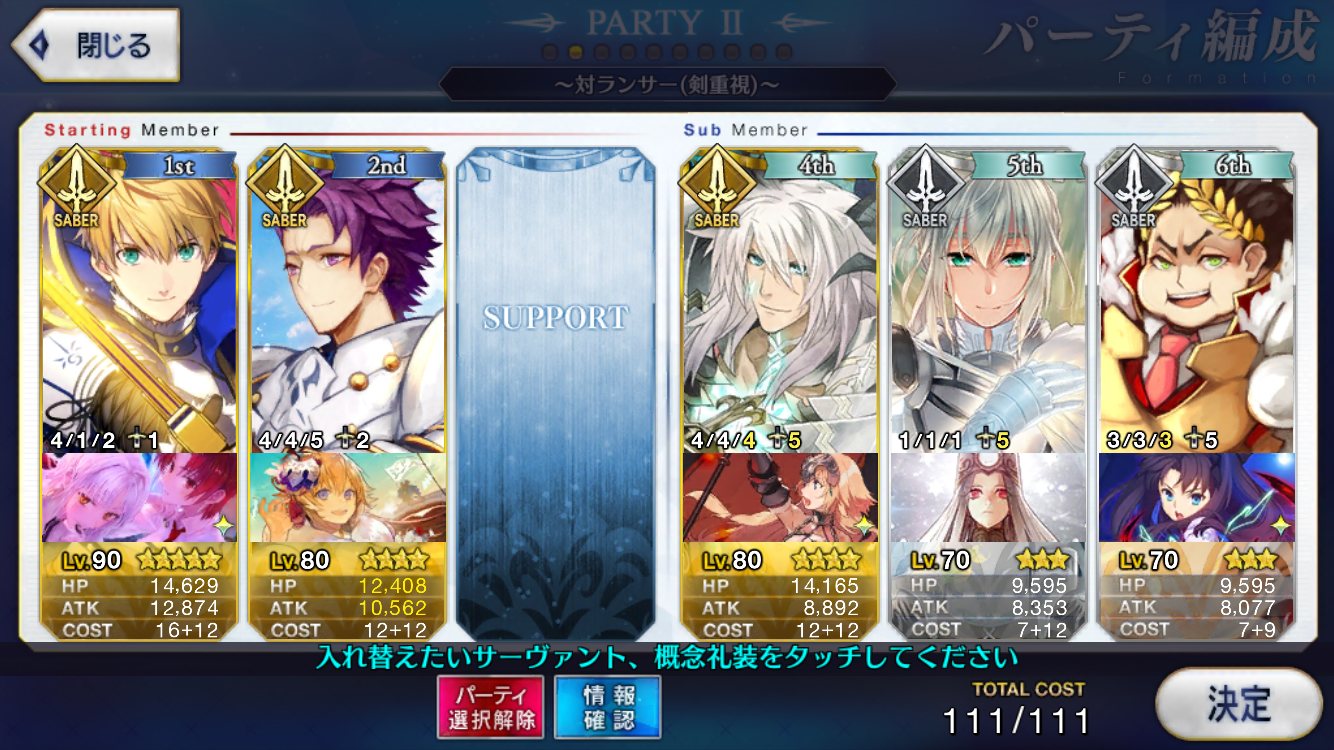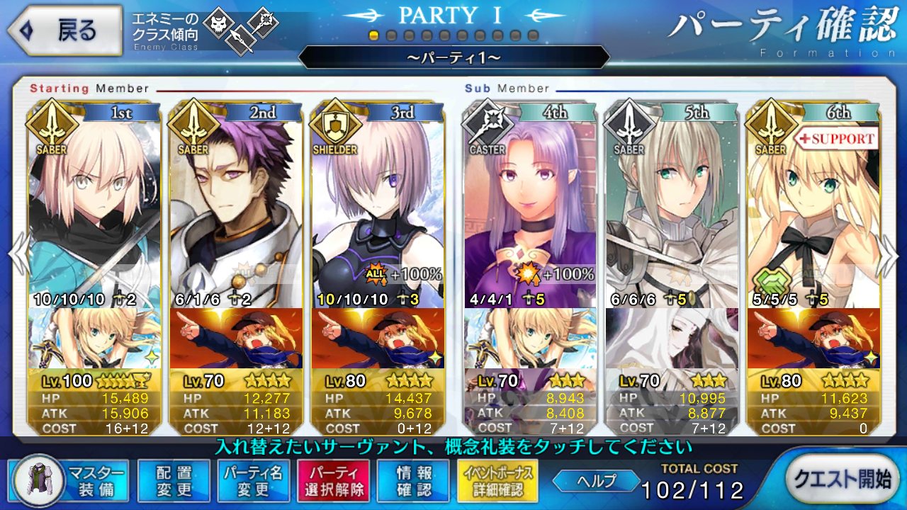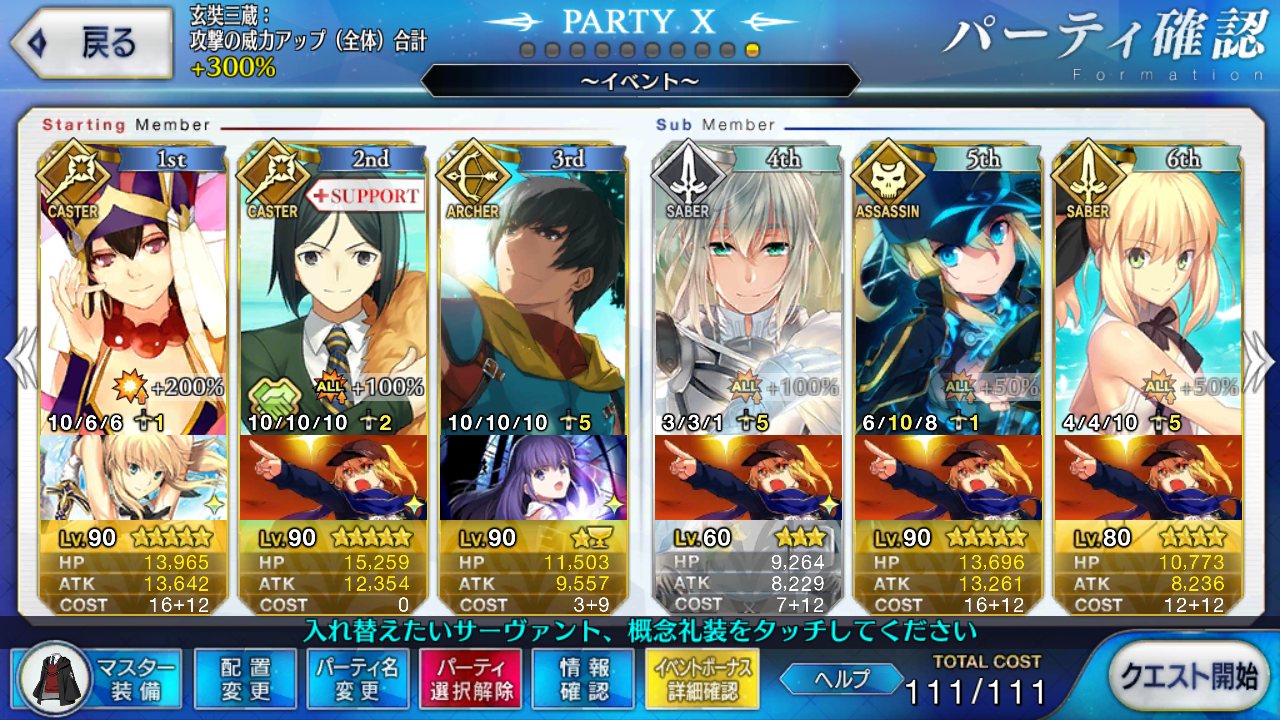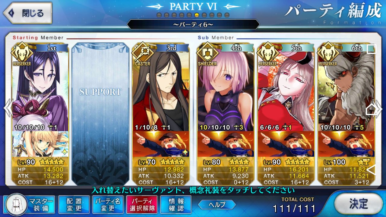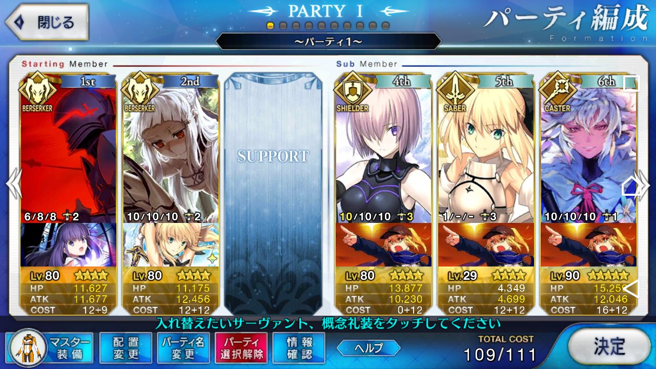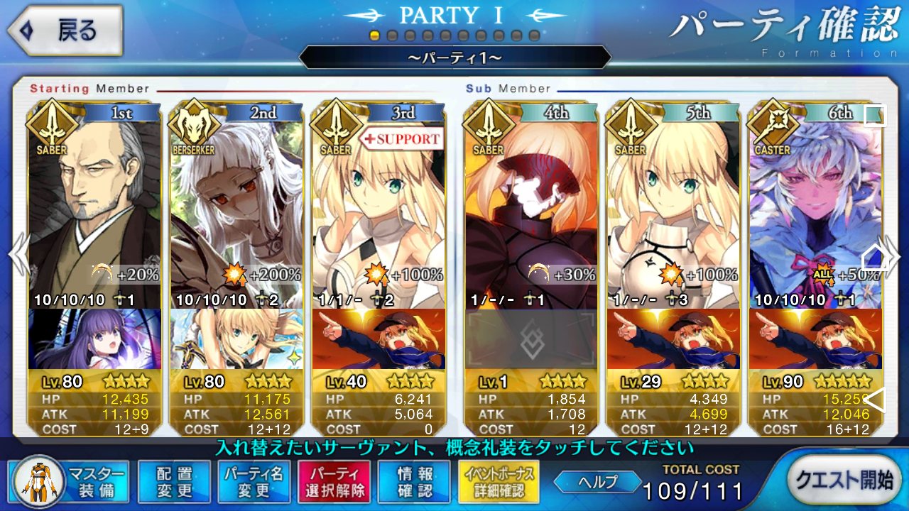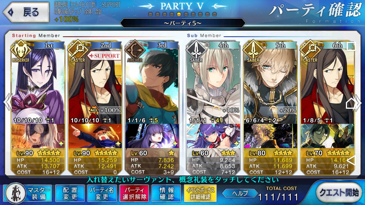 とりあえずアドバイス頂いた通り、ボーナス編成のセイバーは抜いてフレンドの孔明マーリン連れてこようと思います……