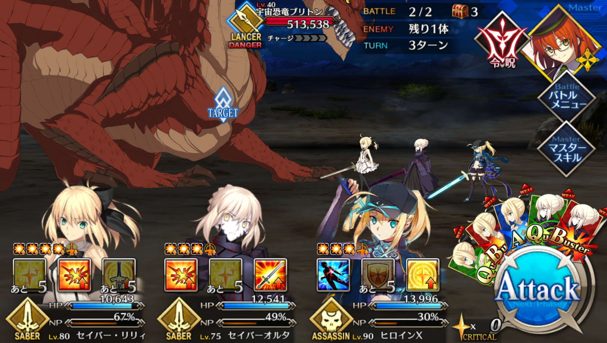 前回はまともに育ってるセイバーがデオンくんちゃんとジークフリートのみ、特効込みでもHP100万のヒロインXがまともに削れなかったし、アルト・ベーダーさんは令呪使ってギリギリの勝利だった