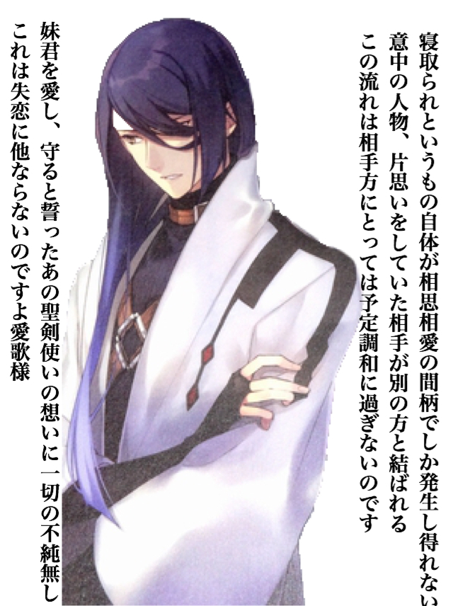 「……くだらん。 この聖杯を、“あれ”が手にしたとしよう。本懐を遂げたとしよう。 だが、その日から長き月日を耐え、忍び、困難に打ち勝たねばならぬ『生きる』という試練が待ち受けているのだ。 それに対し私に出来うる事は、今現在の数刻の苦痛のみ。 何と楽な道か。だがこの程度の事しか、私には“あれ”にしてやれる術が見つからん―― ……以上だ。柄にもなく声をあげるとは私も未熟だな。 では来い、人あらざる者。我が安楽の道を阻んでみるか」