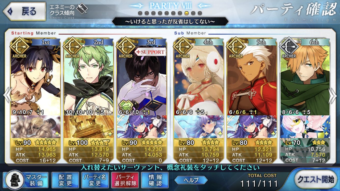 刑部ちゃんはアタッカーのサポートとして使う場合には、自分が殴らなきゃならない分アタッカーとカードが並んだ時になんか中途半端になることがある。というか凸プリコスだと一回宝具打てば殴らずに効果終わりの5ターンでリチャージ完了する花のお兄さんがおかしいと思う。百重塔でおっきー出てきた時絶妙に体力増えたりするから倒しづらいんだよな……